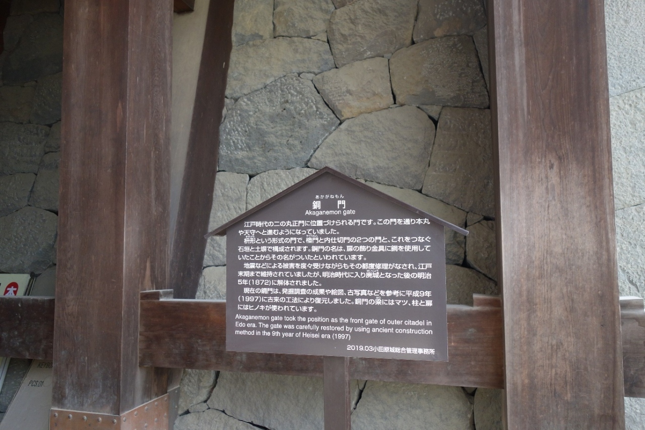 小田原に滞在中、小田原城址公園を訪れた際こちらの門を通りました。公園へ南側から入ると途中で二の丸正門となる銅門を抜けて天守閣の方へ進むことが出来ます。かなり重厚で立派な門で見ごたえが有りました。枡形という形式の門だそうです。
