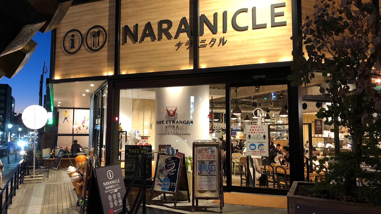 近鉄奈良駅から南へ延びる「やすらぎの道」沿いにあります。「NARANICLE(ナラニクル)」という愛称が付いています。おしゃれなレストラン&カフェが併設されており、外観からは、観光案内所と気付きにくいかもしれません。