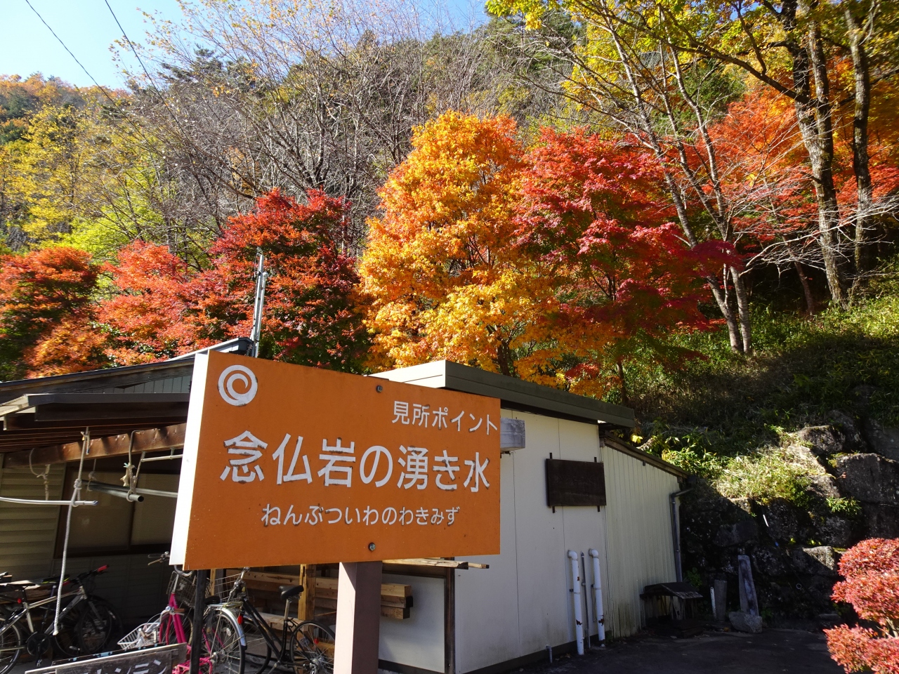 周囲は山に囲まれ馬瀬川が流れ自然豊かなスポット。駐車場の向かいには「念仏岩の湧き水」があり紅葉がきれいでした。