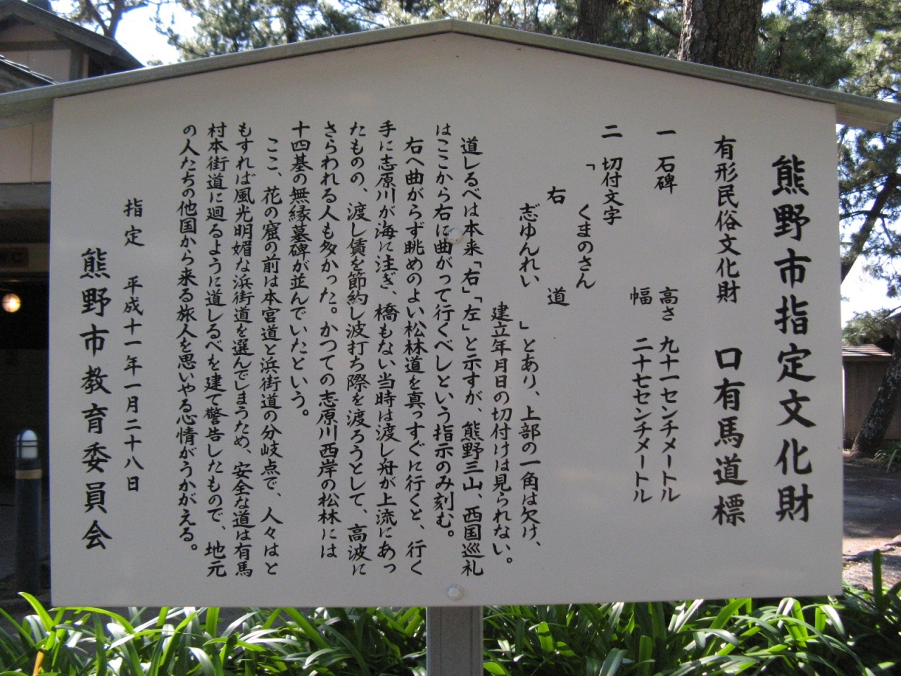 説明板(添付写真参照)には、『ここ、花の窟の前は本宮道と浜街道の分岐点で、人々はともすれば風光明媚な浜街道を選んでしまうため、安全な道は有馬村本街道に廻るよう警告したもの』という説明があります。旅人は景色の良い海岸線に向かいがちというのは昔も今も変わらないという意味で興味深く観ることができました。熊野市指定文化財になっています。
