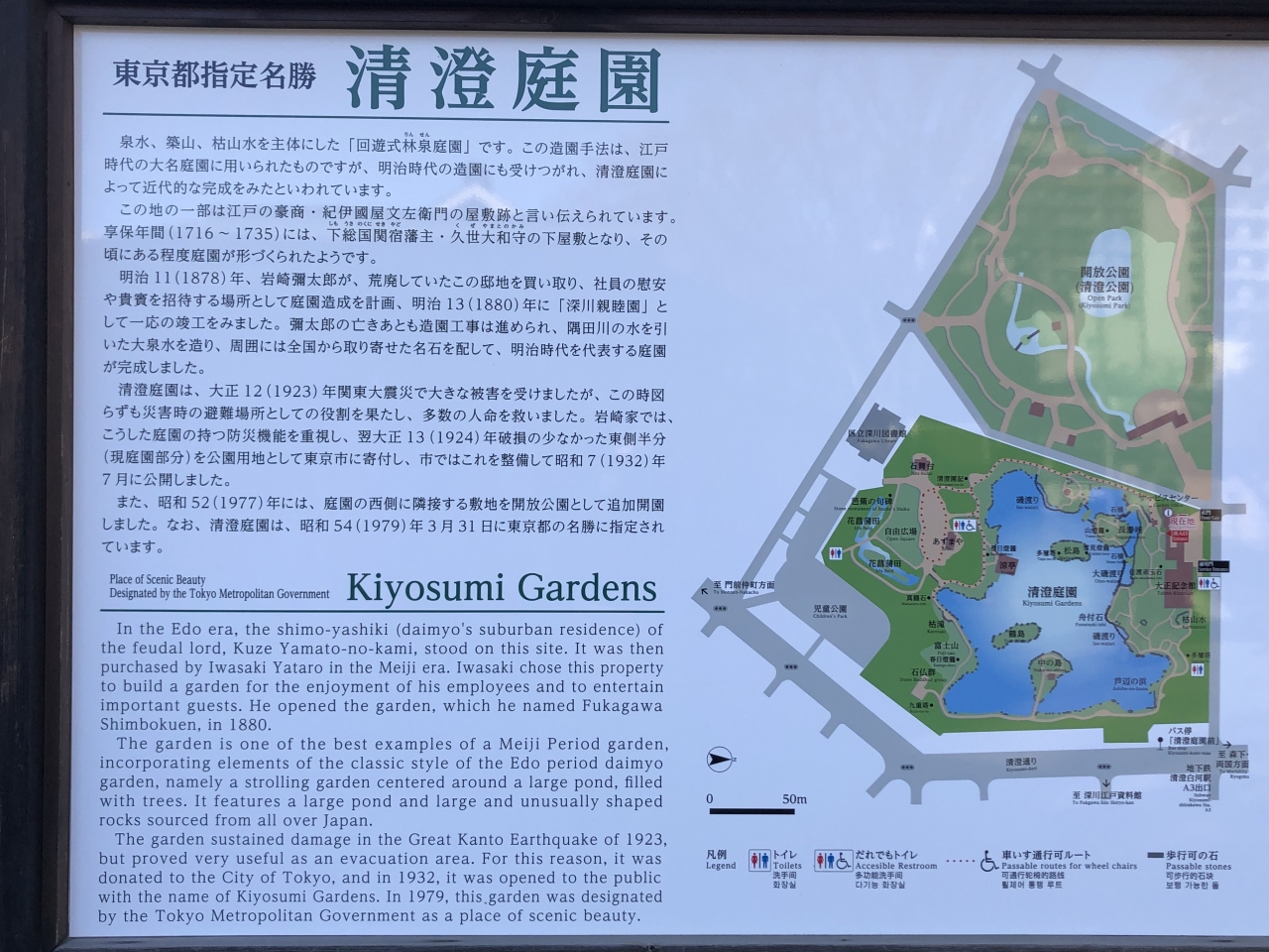 解説によれば、1735年ころ関宿藩主久世家下屋敷の庭園として築かれた。1878年に岩崎弥太郎が手に入れ隅田川の水を引き、泉水、築山、枯山水を主体にした回遊式築山泉水庭とした。この造園手法は、江戸時代の大名庭園に用いられた。1979年に東京都の名勝に指定された。また「清澄庭園」は、関東大震災では災害時の避難場所としての役割を果たし、多数の人命を救った。