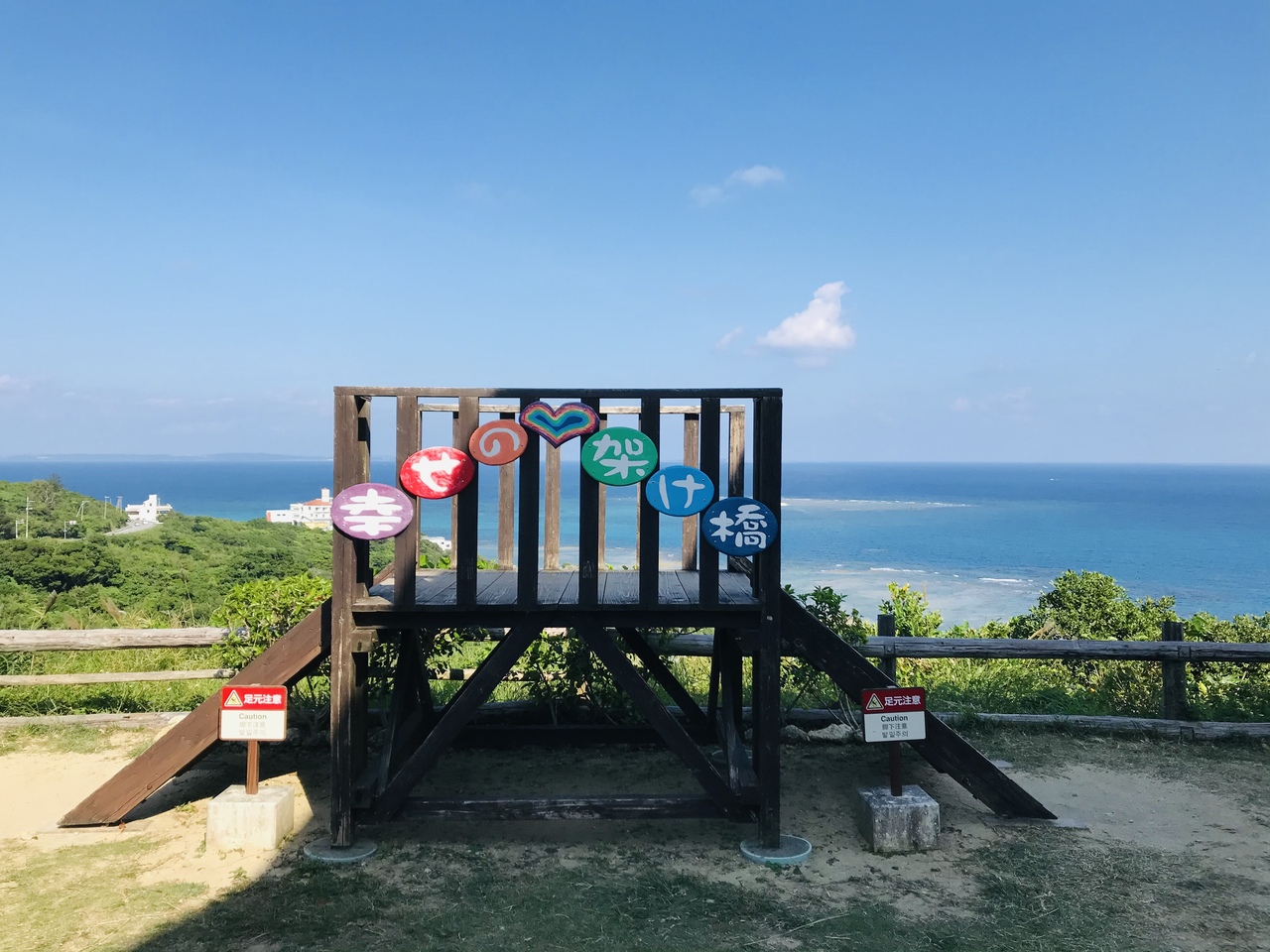 建物の裏手が、ちょっとした休憩スペースになっており、そこから知念の青い海が見えるようになっているのですが、そこにある記念撮影スポット的存在です。