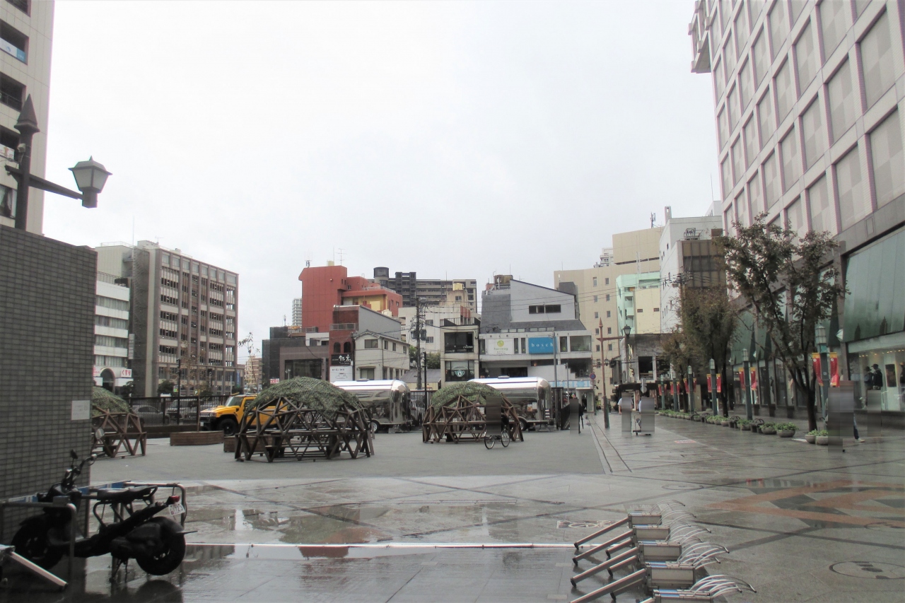 ありそうですがちょっとあり得ないオープン型のミュージアムなので、楽しみにして訪れてみました。小倉井筒屋の周辺とのことなので周辺を廻って探しました。一画に不自然?に開けた場所がありましたが、元の小倉ホテルのあったところだそうで、今は船場広場と呼ぶそうです。この壁面を利用して展示されていたそうなので、すでに終わってしまっていました。残念!