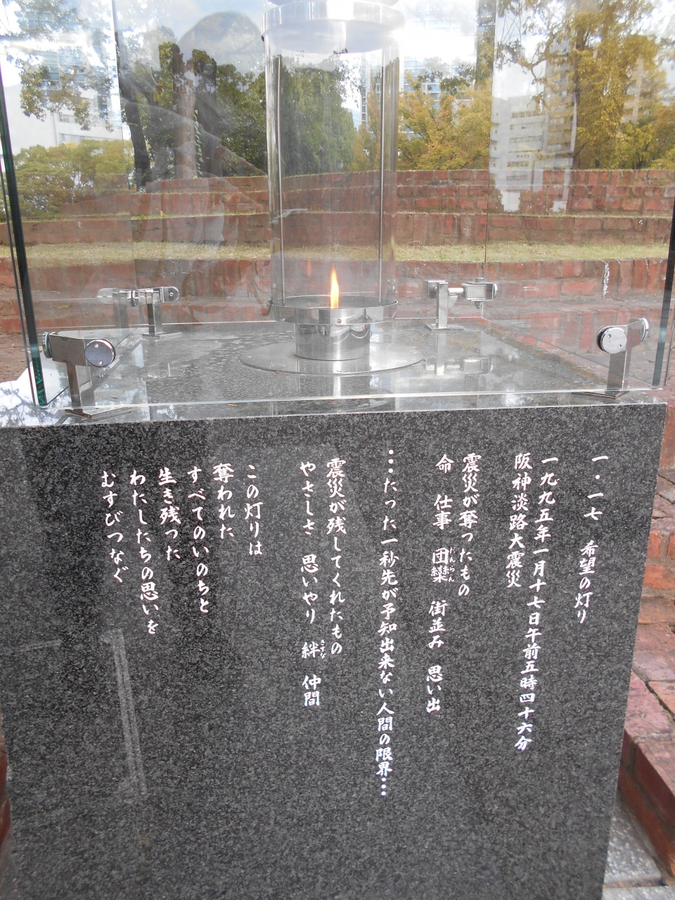 こちらで忘れてならないのは阪神淡路大震災のモニュメント。震災で亡くなられた方の名前が刻まれており、原爆慰霊碑を思わせます。