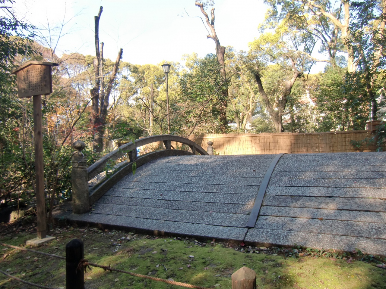 熱田神宮の西門の近くに池があります、池の畔にある小さい橋、今は通れませんが、とても美しい姿です、25枚の板石並んでいる事からが名前の由来、名古屋で最古の石橋。名古屋甚句の中に、宮の熱田の二十五丁橋で、西行法師が腰をかけ、東西南北見渡してこれほど涼しいこの宮を、だれが熱田と名をつけた
