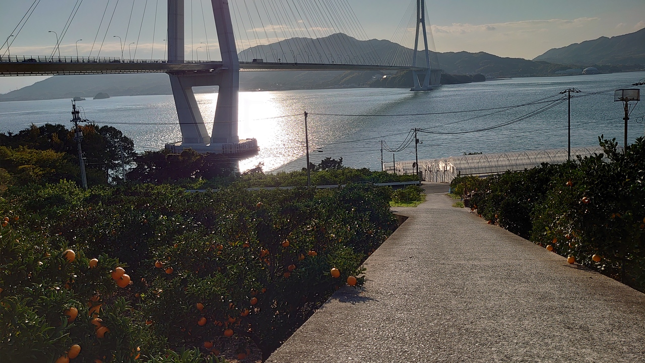 広島県と愛媛県を結ぶ大きめの橋です。今回もゆっくりは観光できませんでしたが、島めぐりを少し楽しみました。生口島のかんきつ畑から温暖な気候がはぐぐむ柑橘類と、おだやかな海にかかる橋を眺めてのんびりとした気分になりました。