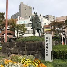 彦根藩初代藩主の像はJR彦根駅西口前ロータリーにあります。ロータリーには車道を渡って行けるようになっていて、間近で見ることができました。馬に乗っている凛々しいお姿で、甲冑はあとから彦根城の博物館で見られて、より鮮やかに井伊直政の騎馬姿がイメージできた気がしました。