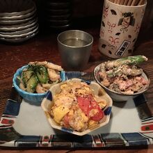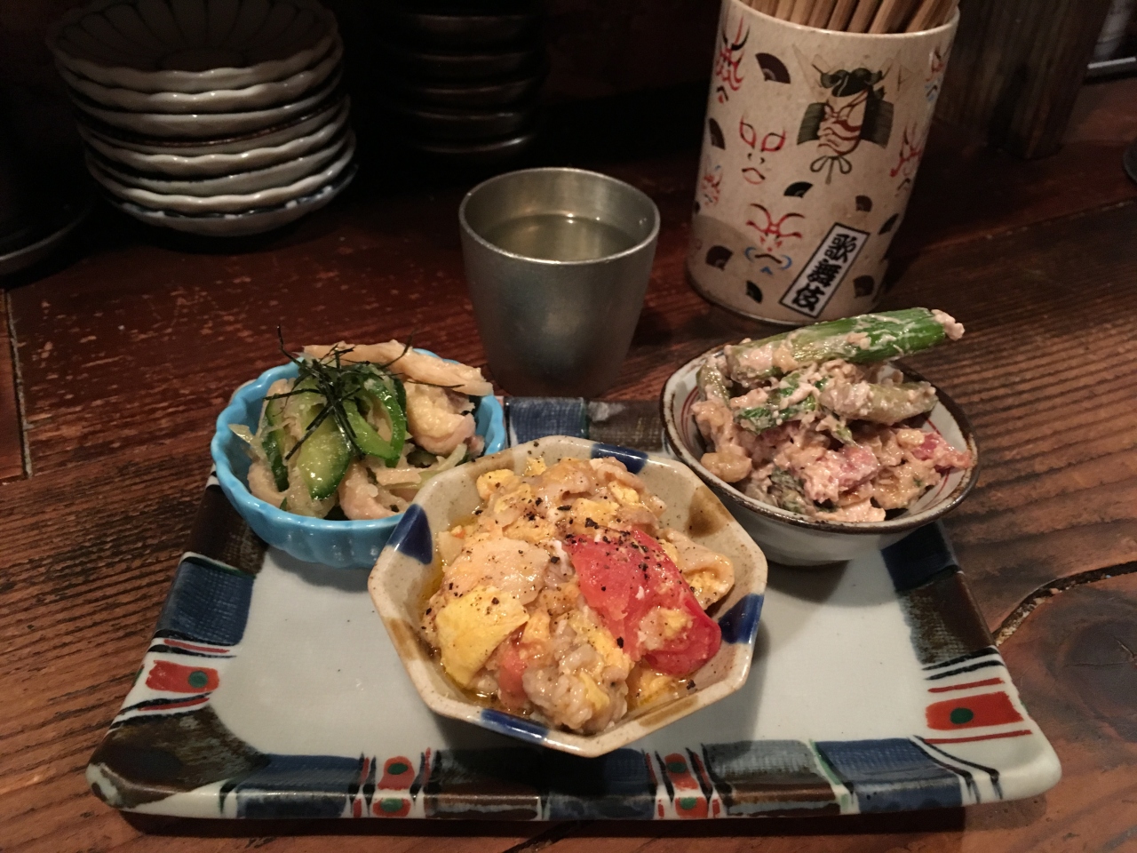 大人気の立ち飲み屋さんとのことで会社帰りに行きました。18時前でしたが暖簾をくぐると混雑気味、2人ぎりぎりで入れました。お料理はどれも美味しく、おまかせおばんざい3種盛を2度注文したのですが、全て違う種類のおばんざいが入っていて驚きました。立ち飲み屋さんというと騒々しい雰囲気を思っていましたが、居心地良くお酒も進みました。外に出ると並んでいる人がいて、人気の程がうかがえました。