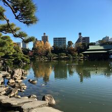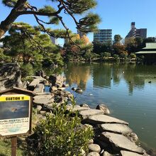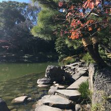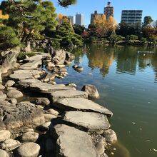 遊歩道の道の沿いの池の端を通る道で、池畔に石が置いてあります。歩く場所は大きな石で陸側に細かな石がありました。横には松が生え、池を見ながら歩くことが出来、景観が良いですが池の水は濁っていました。歩ける石は平になっています。