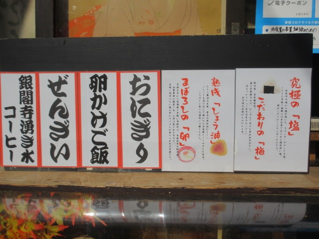 京都にあるお店です。場所は銀閣に向かう参道のところです。お米にこだわったお店だそうで、ネットで好評でしたので訪問したのですが、昼を過ぎていったので、残念ながら定食は売り切れでした。なのでおにぎりをいただくことにしました。土鍋で炊いたご飯だそうで、確かにおいしい。大きさはちょっと小さめなので、他の食べ歩きにも差し支えないかな。