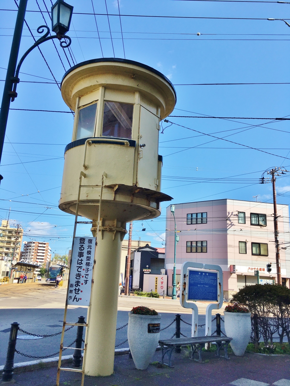 函館どっく行きと谷地頭行きの市電の分岐点となる十字街にあります。路面電車用としては日本最古のもので、1939年から1995年まで塔の中で係員が手動で操作していたそうです。最盛期には6箇所あった操車塔も、現存するのはこの1か所のみとのことです。街中を歩いていると、日本最古など古い建物が所々にあり、古いものを大切に残しているところに共感しました。