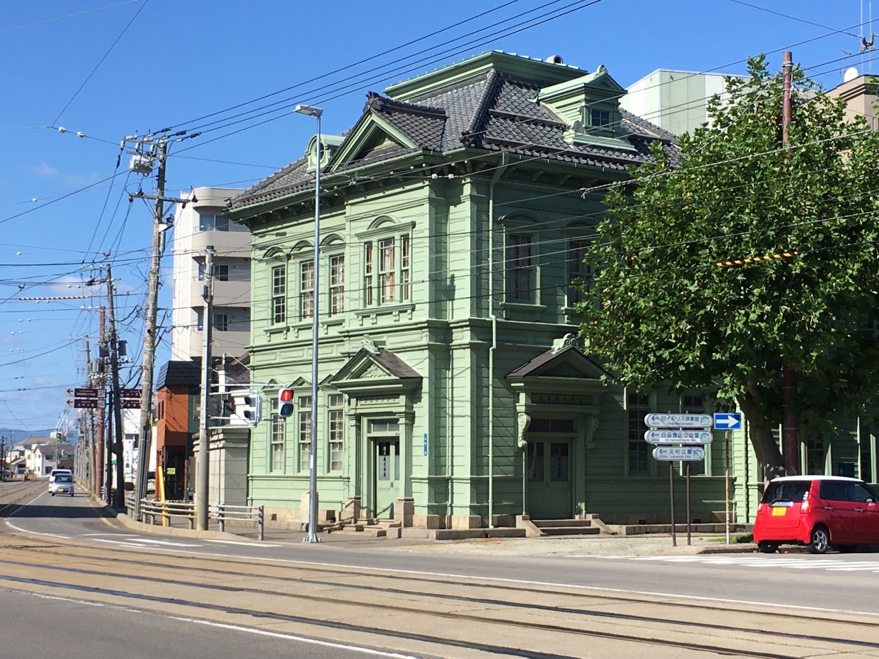基坂の下、交差点角にあるグリーン系の外観が印象的な洋館は、1916年に建てられた相馬株式会社です。とても素敵な外観で市電通りに面しているので、電車と一緒に写真に収めたかったのですが、交通量の多い車道なので難しく良い写真は撮れませんでした。建物は現在も現役で使われていて、主に不動産賃貸業を手掛けているそうです。