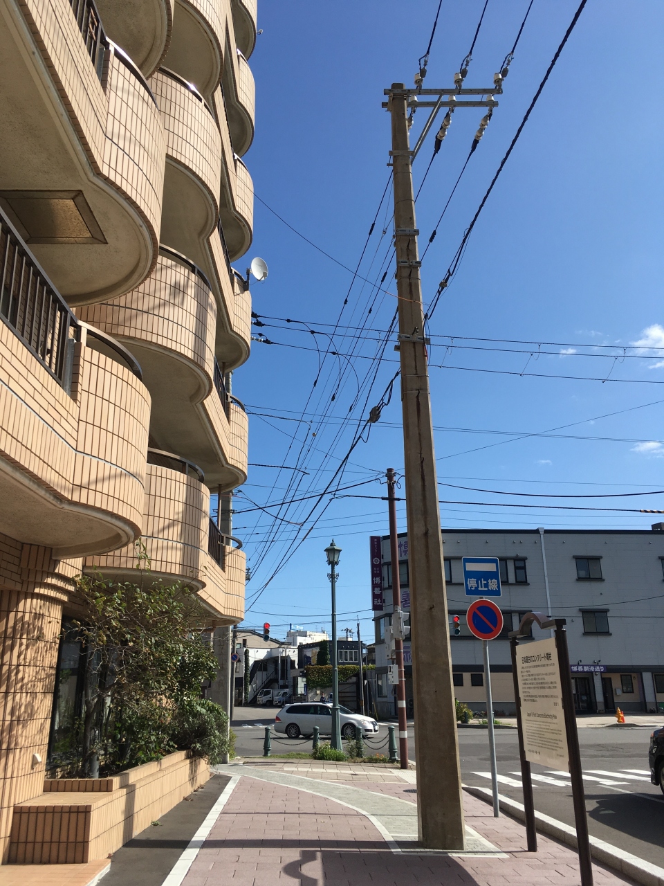 ベイエリアへ向かう途中偶然見つけました。函館水電公社により1923年に建設された電柱で、コンクリート製の電柱としては日本最古のものです。他の電柱と違い、四角形で少し変わった形状をしています。現在も耐久年数を超えて、現役で使用されているとのことです。説明の看板があって気づいたのですが、何もないとわからず通り過ぎていたと思います。