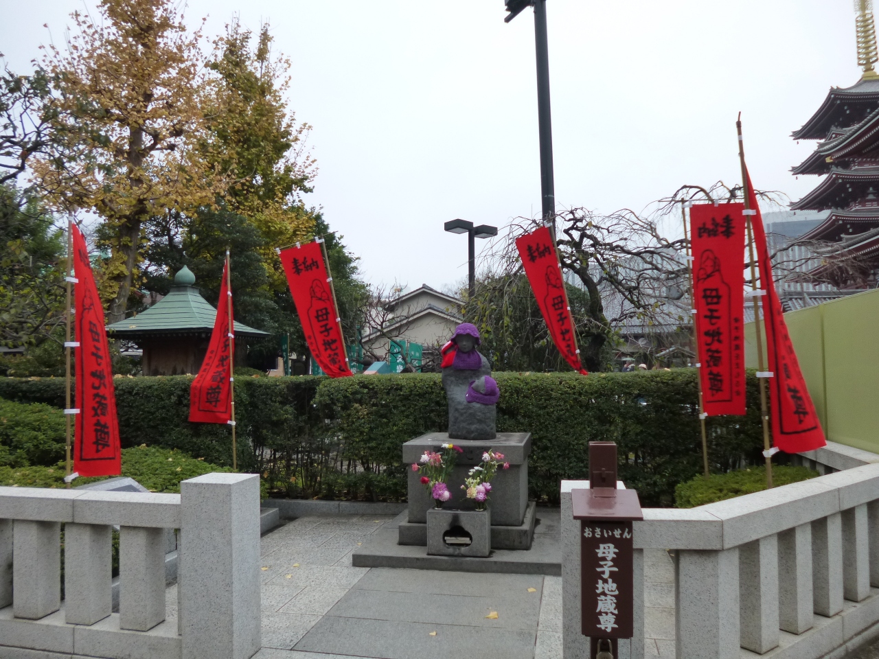 浅草寺の宝蔵門の近く、久米平内堂の裏側に母子地蔵尊があります。第二次世界大戦末期、旧満州で逃げる途中に離れ離れになってしまった多くの母と子のためにたてられたお地蔵さんです。満州で幼少期に終戦を向かえた、漫画家のちばてつやさんのデザインだそうです。手編みの帽子とマフラーが暖かそうです。