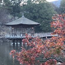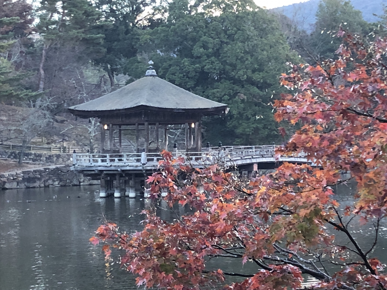 11月末の早朝散策で行きました。鷺池の中央に浮かぶ池中東屋です。この日はちょうど池に朝もやがかかっていて、池畔の残り紅葉越しにみた浮見堂はまさに風流そのものでした。渡り橋があるので浮見堂まで行くこともできます。池の中央からの景色もまた最高でした。