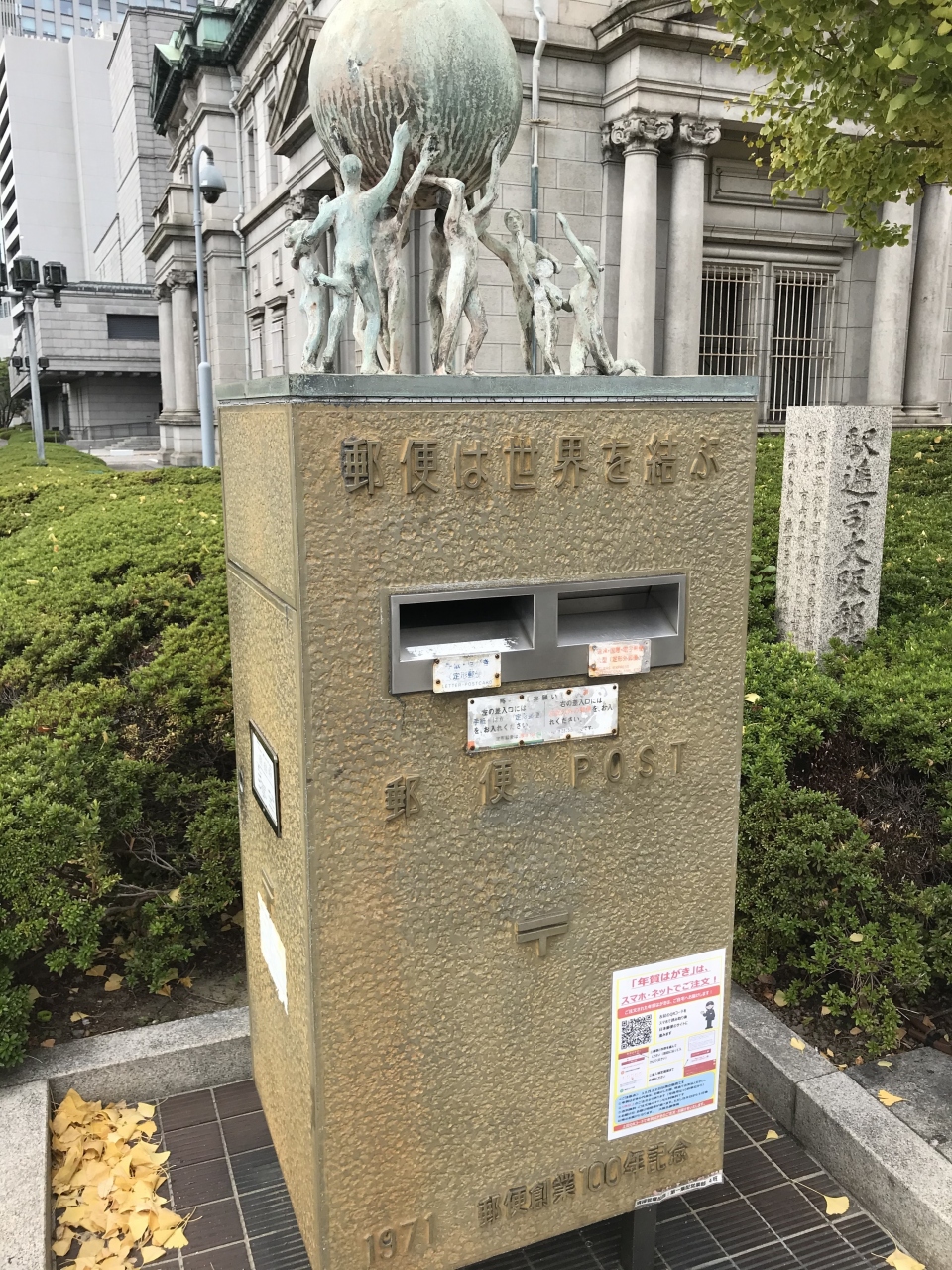 1871年に郵便制度が設けられて、大阪、京都、東京に「郵便役所」(中央郵便局のようなもの)が置かれ、大阪の郵便役所がこの場所に設置されたようです。またこの場所はもともと、島原藩の蔵屋敷があった場所らしいです。