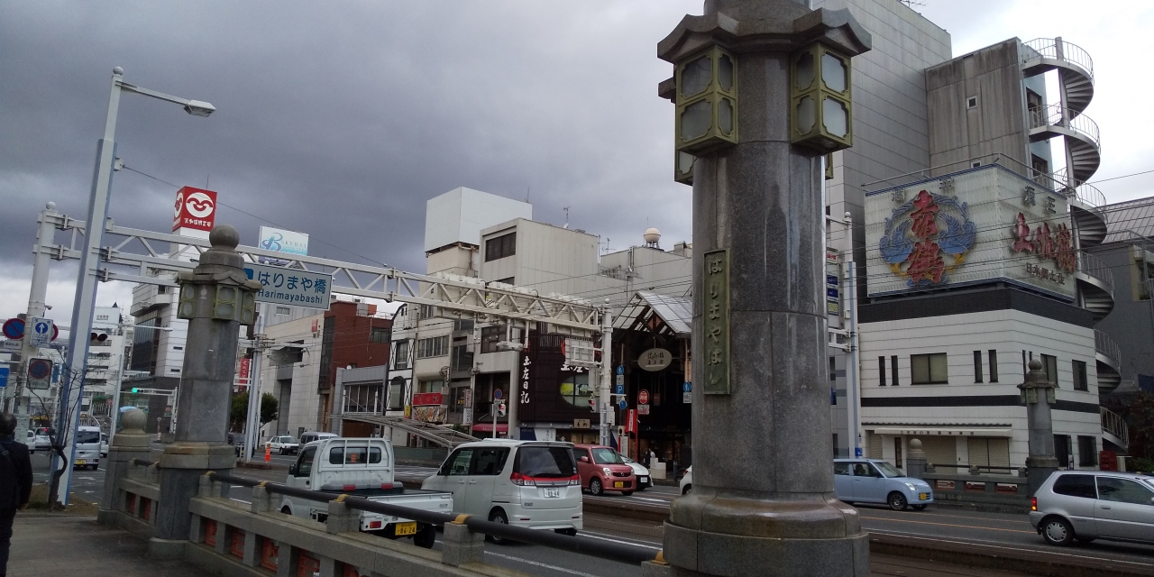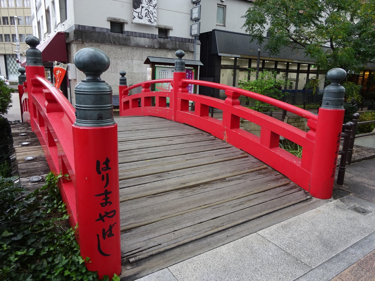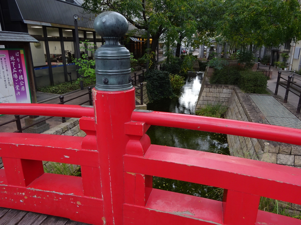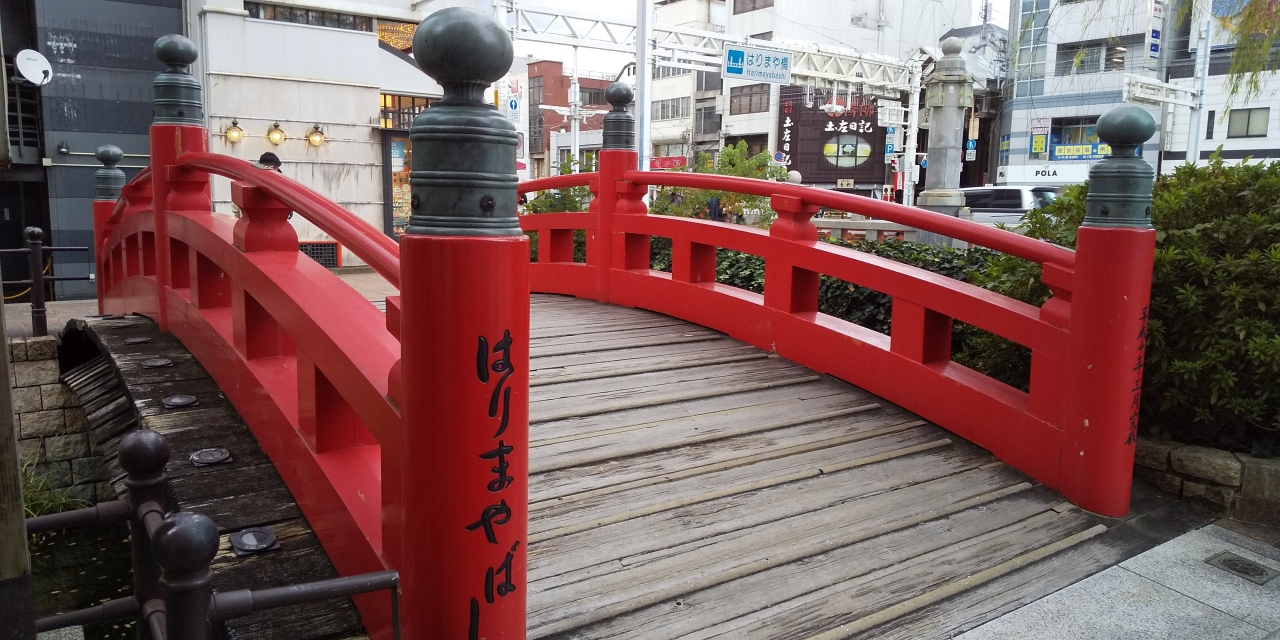 橋は朱塗りで短く、観光用に再現されたものでしょうか。現在は、地名として商店街や駅名で根付いているようです。