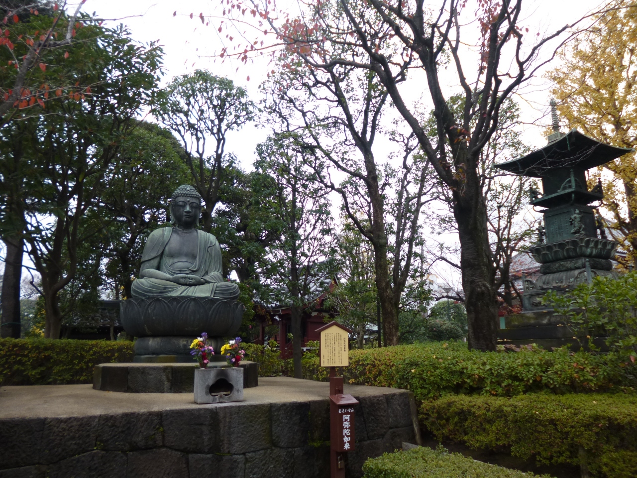 浅草寺の境内、本堂の西側、本堂の方を向いて鎮座している阿弥陀如来像です。宝蔵門の近くにも阿弥陀如来像があります。本堂に近いこちらの本阿弥陀如来坐像は銅製、鋳造で、江戸時代、神田鍛冶町の鋳物師が制作したものだそうです。江戸鋳物師の作風を伝える貴重なものだそうです。願主は理性院宗海という僧侶で、近隣の商人や職人さんなどさまな職業の人たちの協力と思いによって立てられたもので、当時の信仰の有り様を知ることができます。