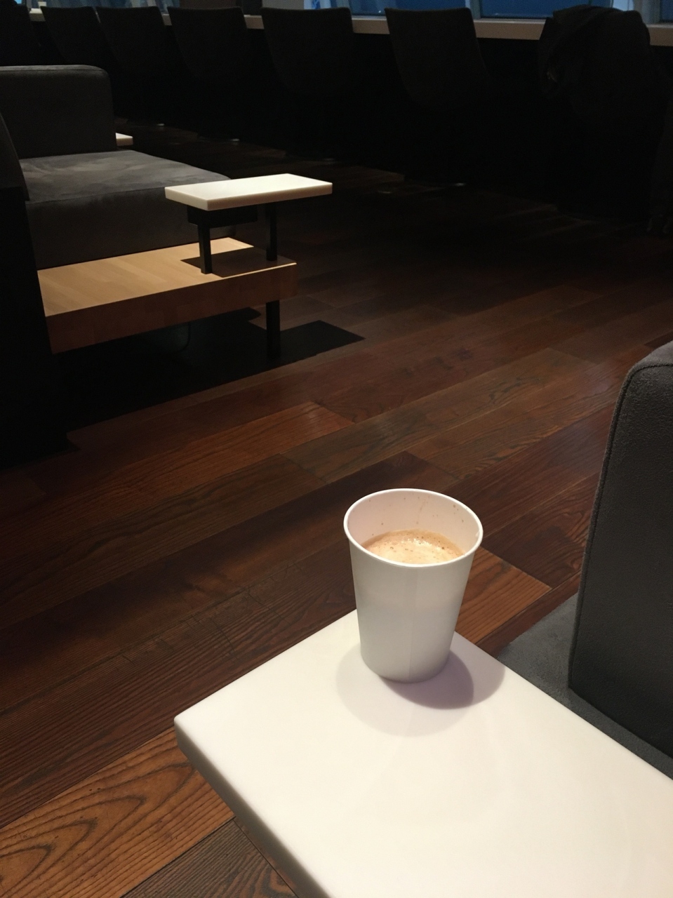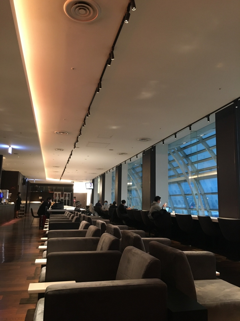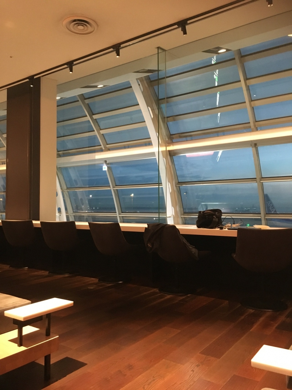 搭乗ゲート56番付近にありました。カウンターからは滑走路が見え、眺めが良かったです。ドリンクはフリードリンクで、スタッフの方に紙コップを渡されました。椅子がゆったりとしていて各椅子に電源コンセントがあり充電出来、便利でした。