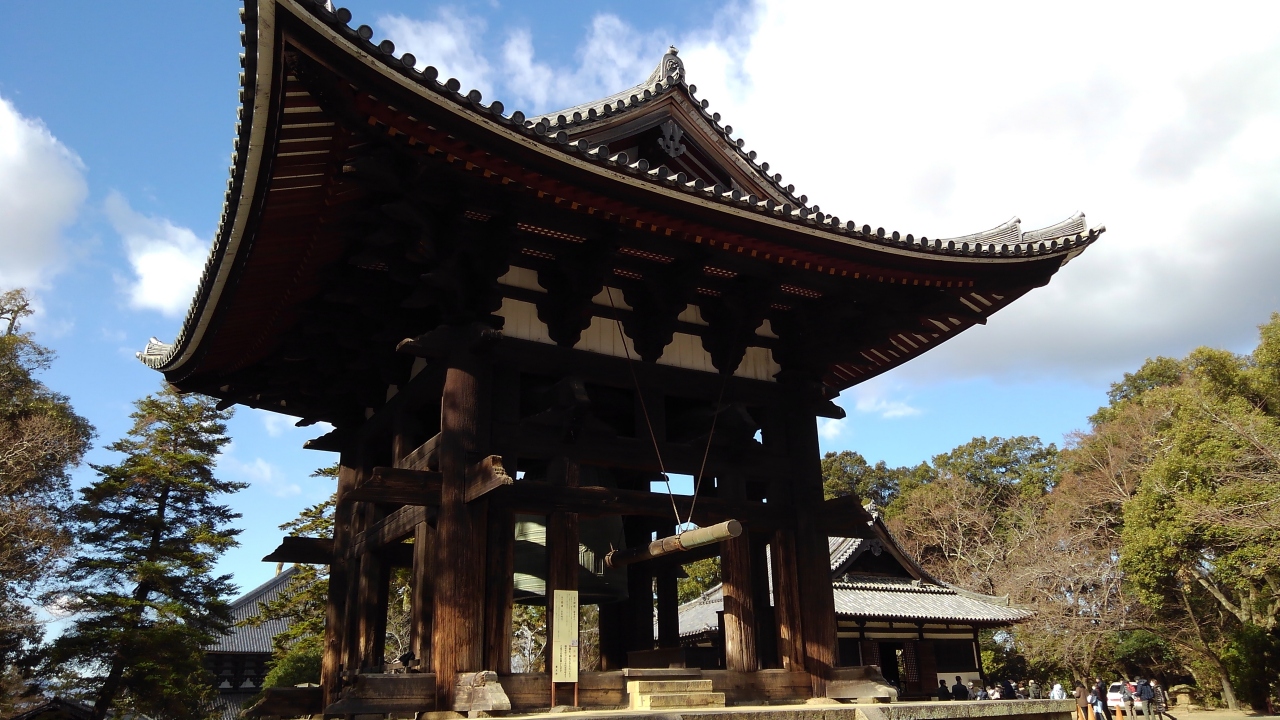 東大寺二月堂・三月堂参拝の帰り道、少し横道に入ったところにあるのが大釣鐘と鐘楼です。大きいので見つけやすいですが、まっすぐ行ってしまうと見逃してしまいます。鐘も建物も国宝で相当古い時代のものですので、見逃さないようにしてください。