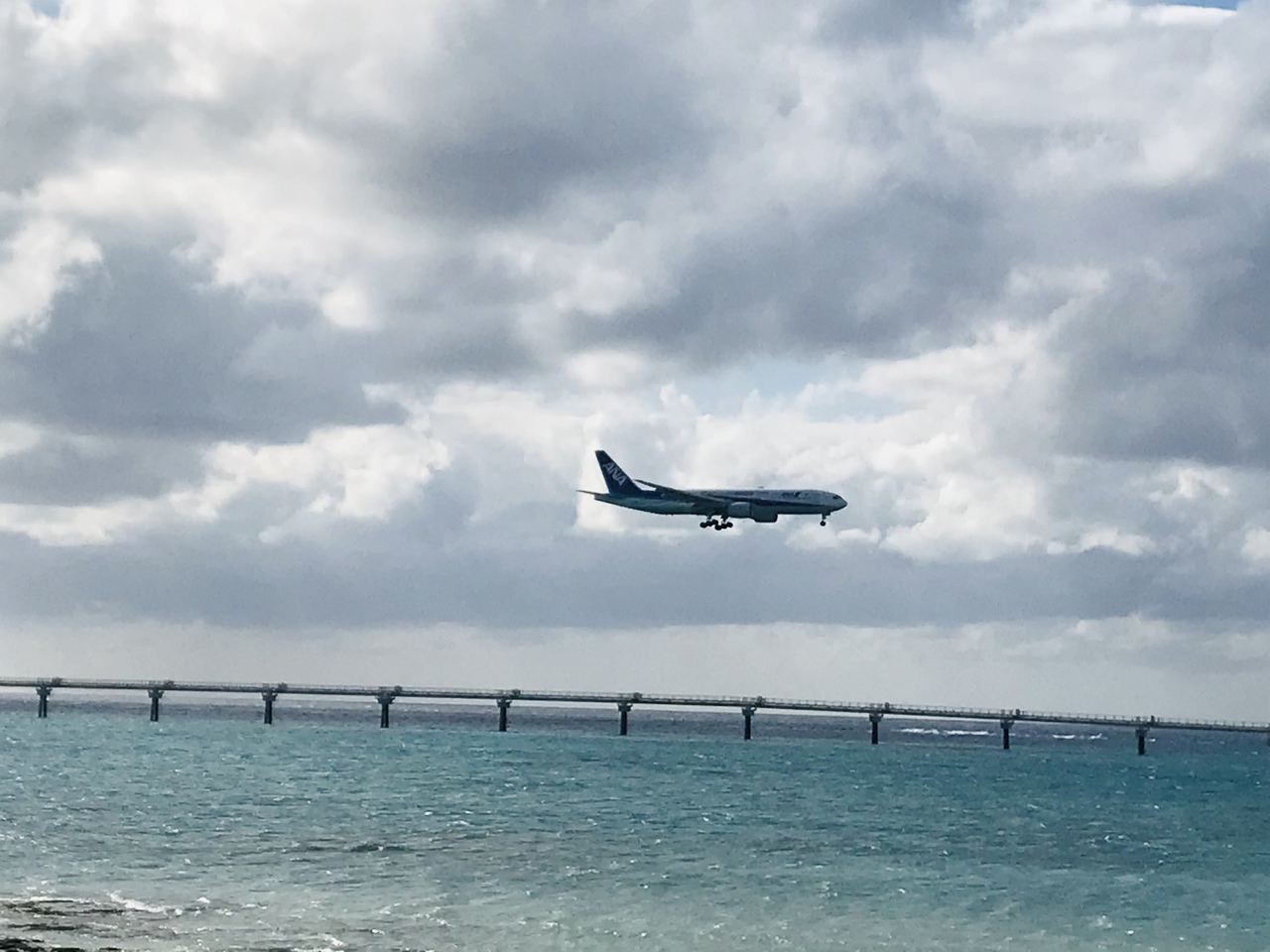 瀬長島は、那覇空港の滑走路進入経路下にあり、飛行機の離発着を存分に眺めることができます。