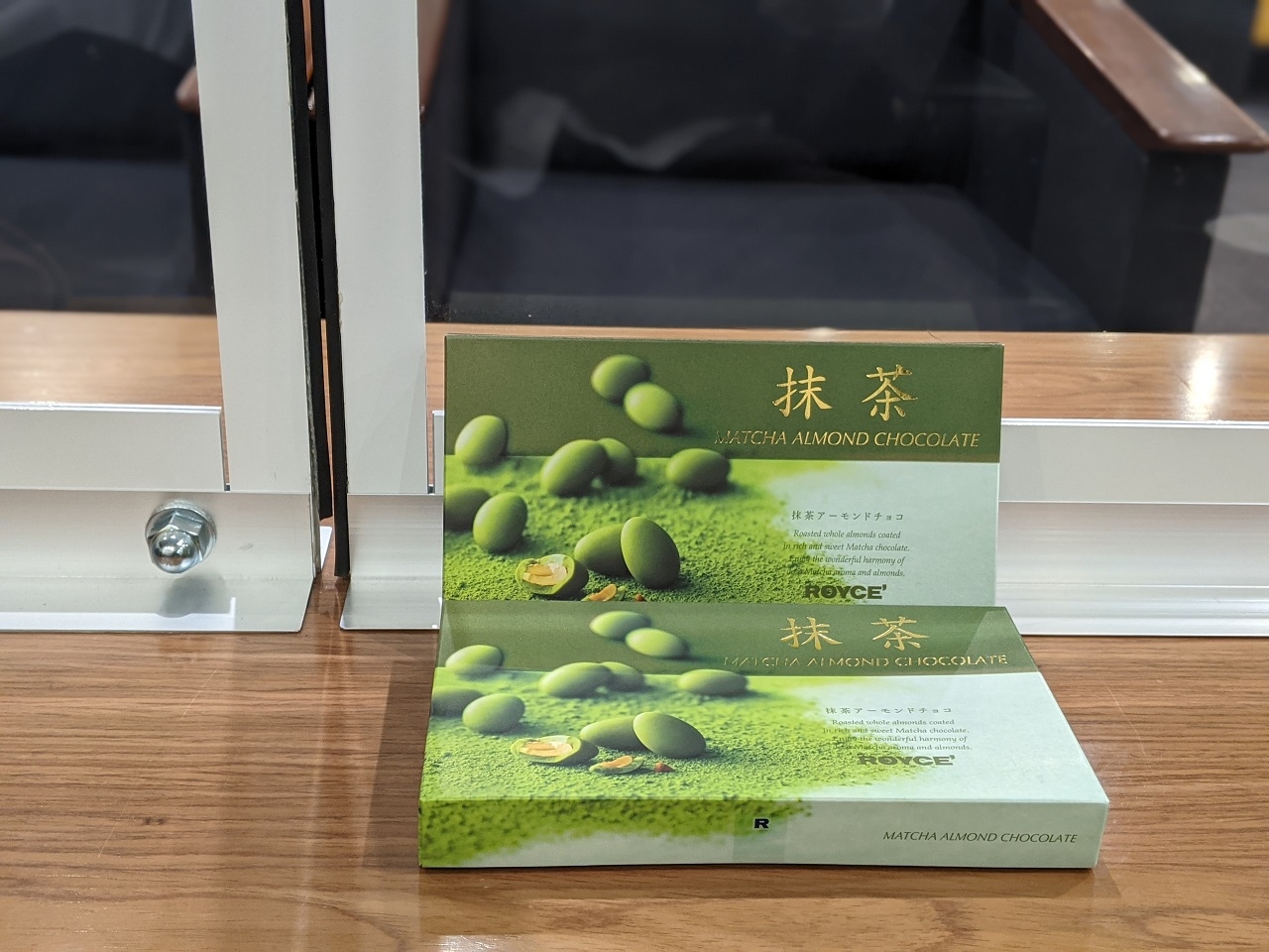 函館空港の2階、エスカレータを上がって左側にお店はあります。お店のスペースはそれほど広くありませんが、お土産に喜ばれそうなロイズオリジナルのチョコレート菓子などが沢山並んでいます。昨今の流れで、袋が有料化されています。この日はGoToトラベルの地域共通クーポン(電子)が2,000円残っていたので、1,080円の抹茶アーモンドチョコを2個購入しました。