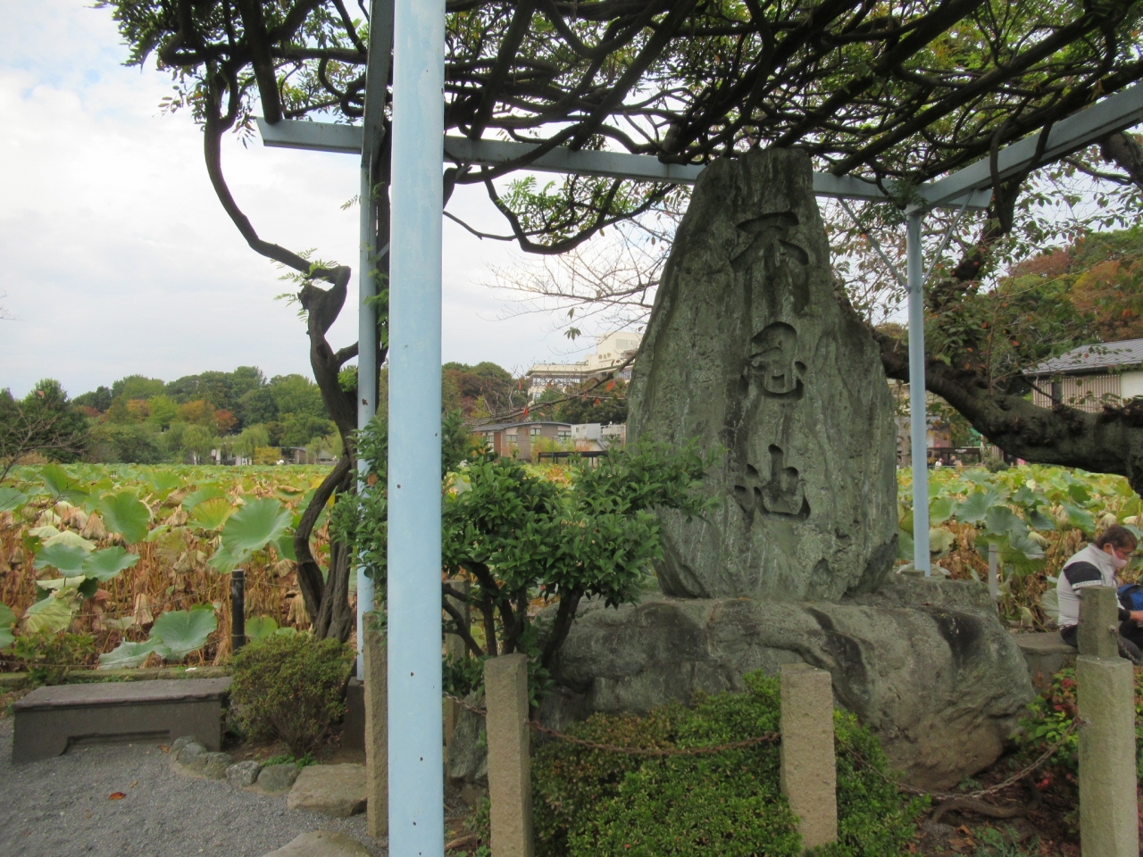 上野公園不忍池の弁天堂の前の参道の片隅に、こちらの大きな碑がありました。参道には露店が並ぶことも多くて、影に隠れてしまいがちでしたが、今は露店が少ないため、目立っていました。崖から取り出してきたような堅牢な岩に不忍池と刻まれていて、違和感がありました。