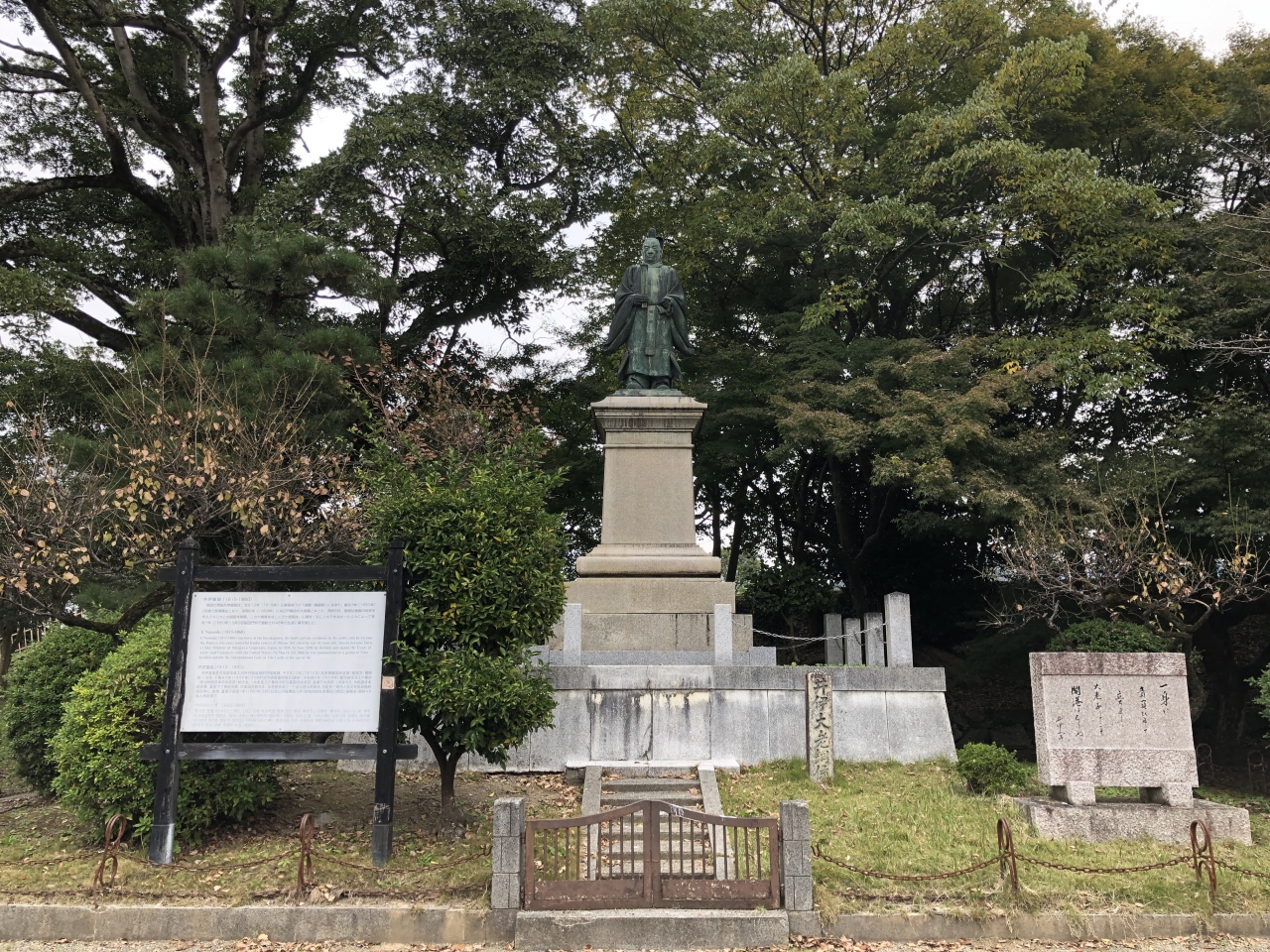 彦根城の近くの玄宮園と佐和口の中間ぐらいにあります。高い台の上に当時の官職の正装で立っています。周囲には井伊直弼が17歳から32歳までの15年間を過ごした埋木舎(うもれぎのや)などの関連施設もあり、あわせて訪問することで井伊直弼の人となりに触れられると思います。