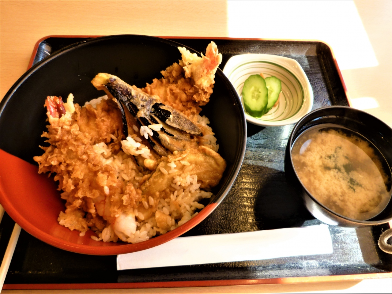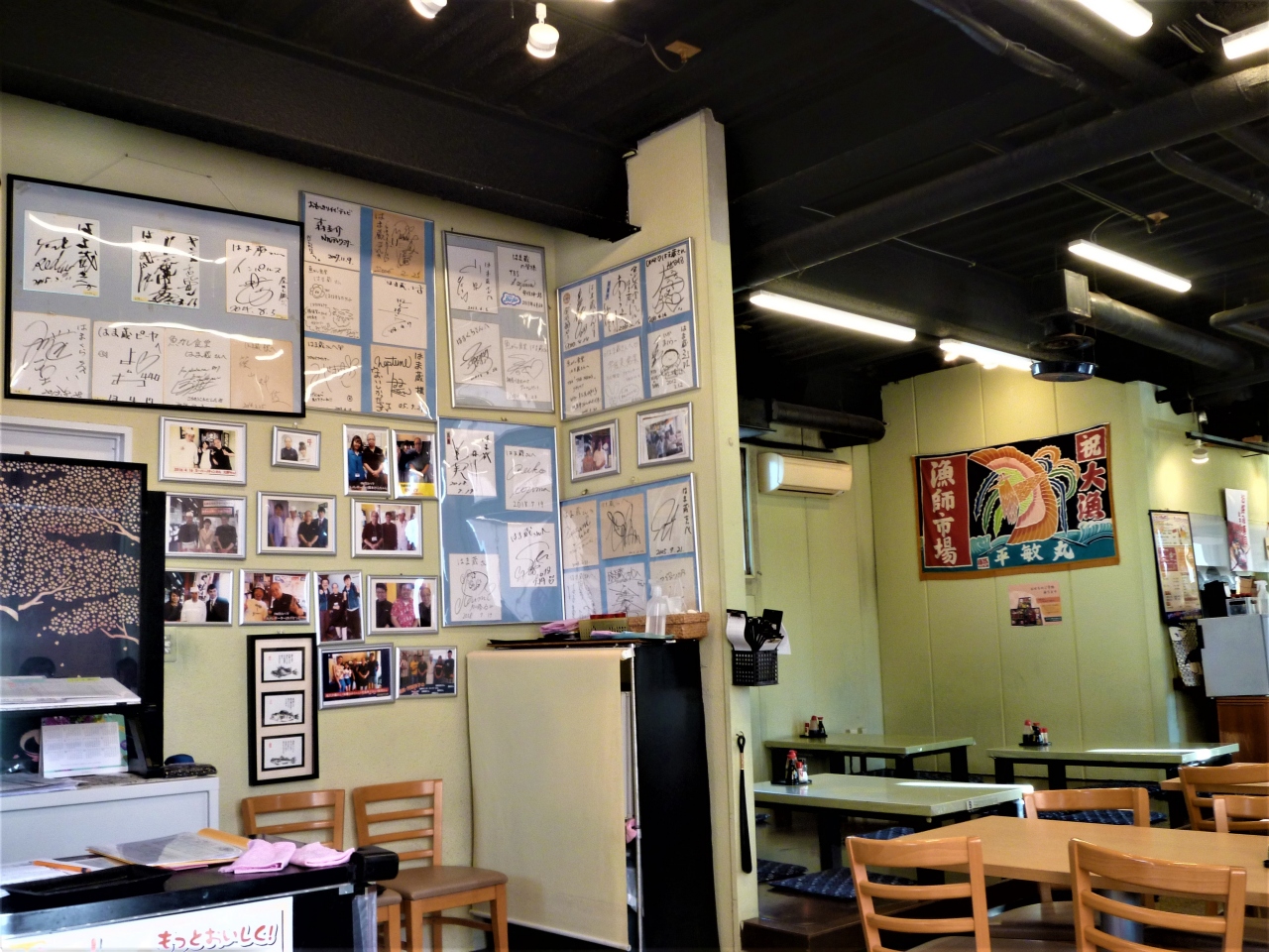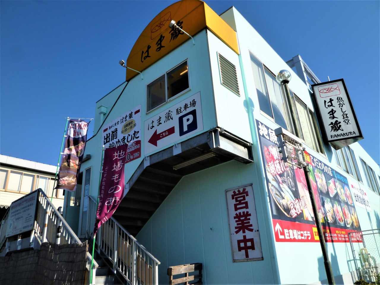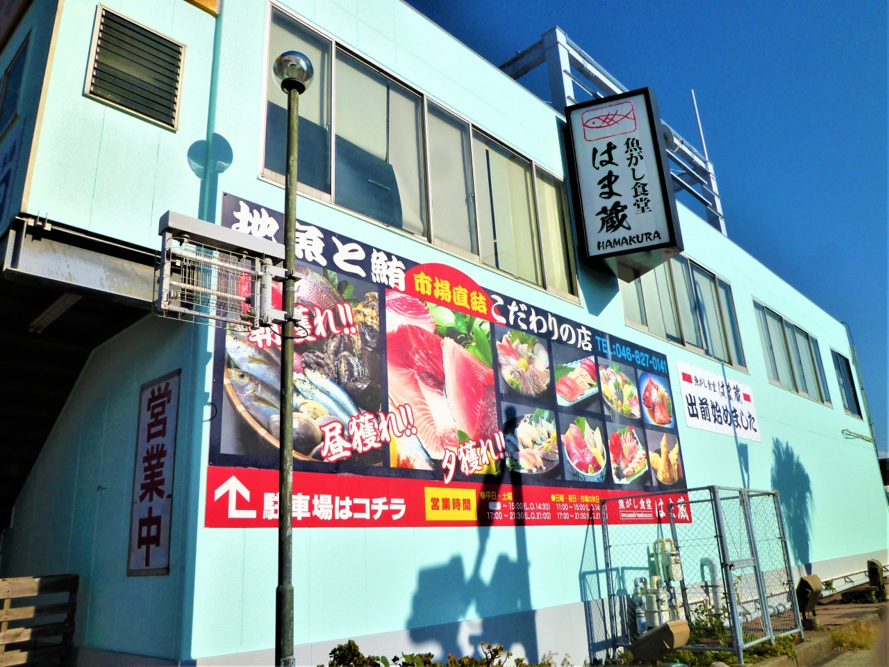 よこすか海岸通りの`横須賀魚市場`の中にあります(海辺釣り公園の隣);[市場直結/地魚と鮪/こだわりの店…魚がし食堂 はま蔵]です。大通りから`青い建物と大きな魚々の看板`が良く見えます;横須賀魚市場建物は灰色 お店で目立つのは芸能人`sの色紙/マスターとの記念写真♪ 少し遅れてランチ(それでも半分以上席が埋まっていました!);天丼(大好物;普通のお店との違うタレ)を美味しく食べました(^^)