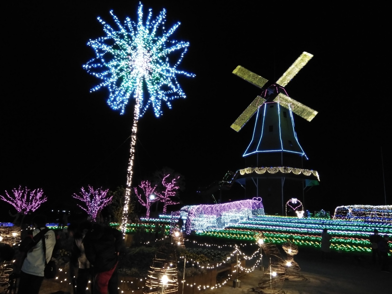 今年もイルミネーション見学に行きました。冬休みに入る前の平日、やや明るいうちに到着したので会場近くに駐車も出来ました。時間になるまで霞浦の湯で温まり、出ると綺麗な風車が見えました。水面に映る蓮などは無く、例年の比べるとやや縮小された感じはありましたが開催されて良かった!来て良かった!と思える輝きでした。