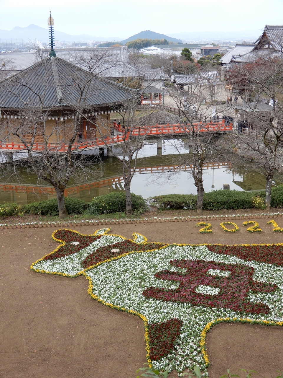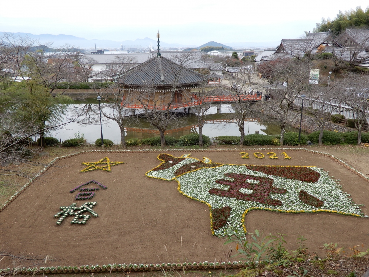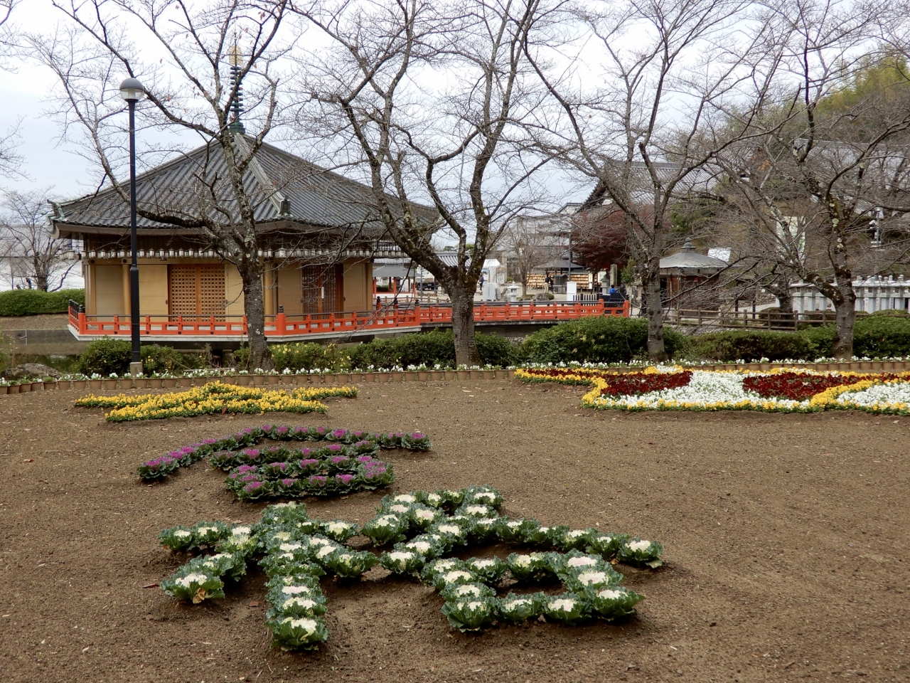 そこから境内に描かれたジャンボな干支の花絵を眺める事ができます