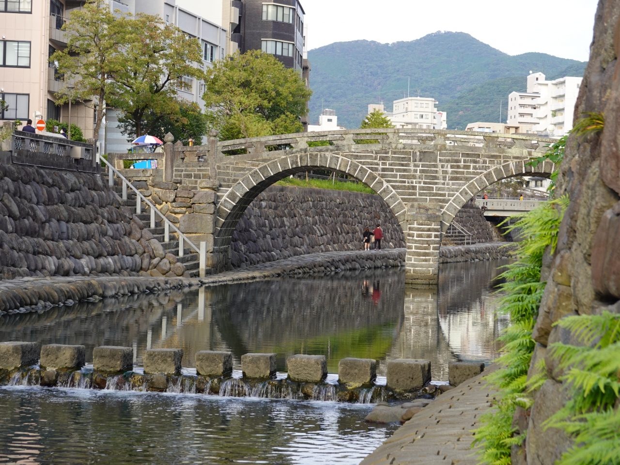 長崎市街を流れる「中島川」沿いに「中島川公園」があります。中島川と中島川に架かる橋を眺めるのに最高のスポットで、風情ある光景が楽しめます。一番印象的なのはやはり「眼鏡橋」で、その上流下流には飛び石が配置されており、地元の高校生などで賑わっていました。