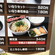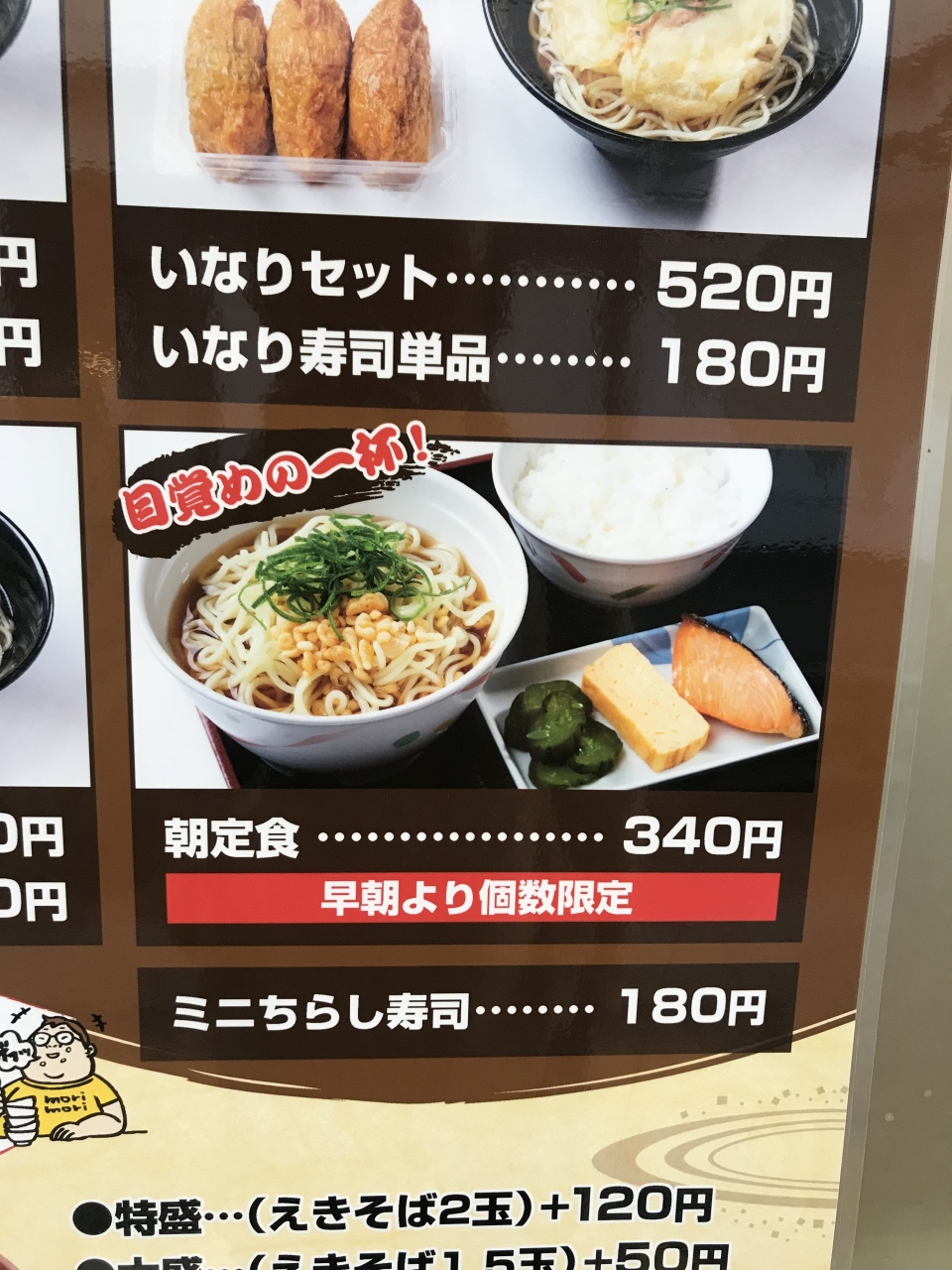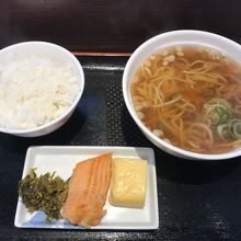 朝定食はお得意で、ご飯、焼き鮭、玉子焼きに高菜漬にそばが付いて340円