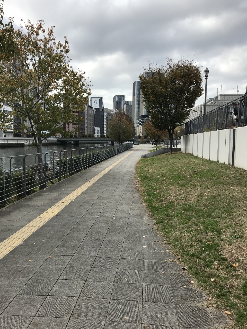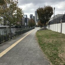 正式名所は「都市計画道路中之島歩行者専用道」といって、昭和53年に都市計画が決定しています。堂島川と土佐堀川の耐震護岸工事と同時進行的に整備されたようです。大阪市役所南側の部分については「みおつくしプロムナード」という愛称が付けられています。