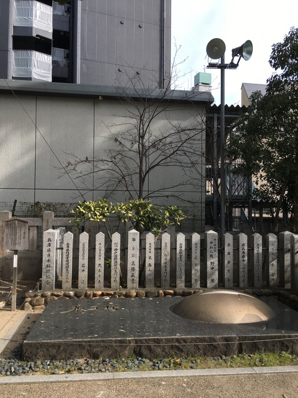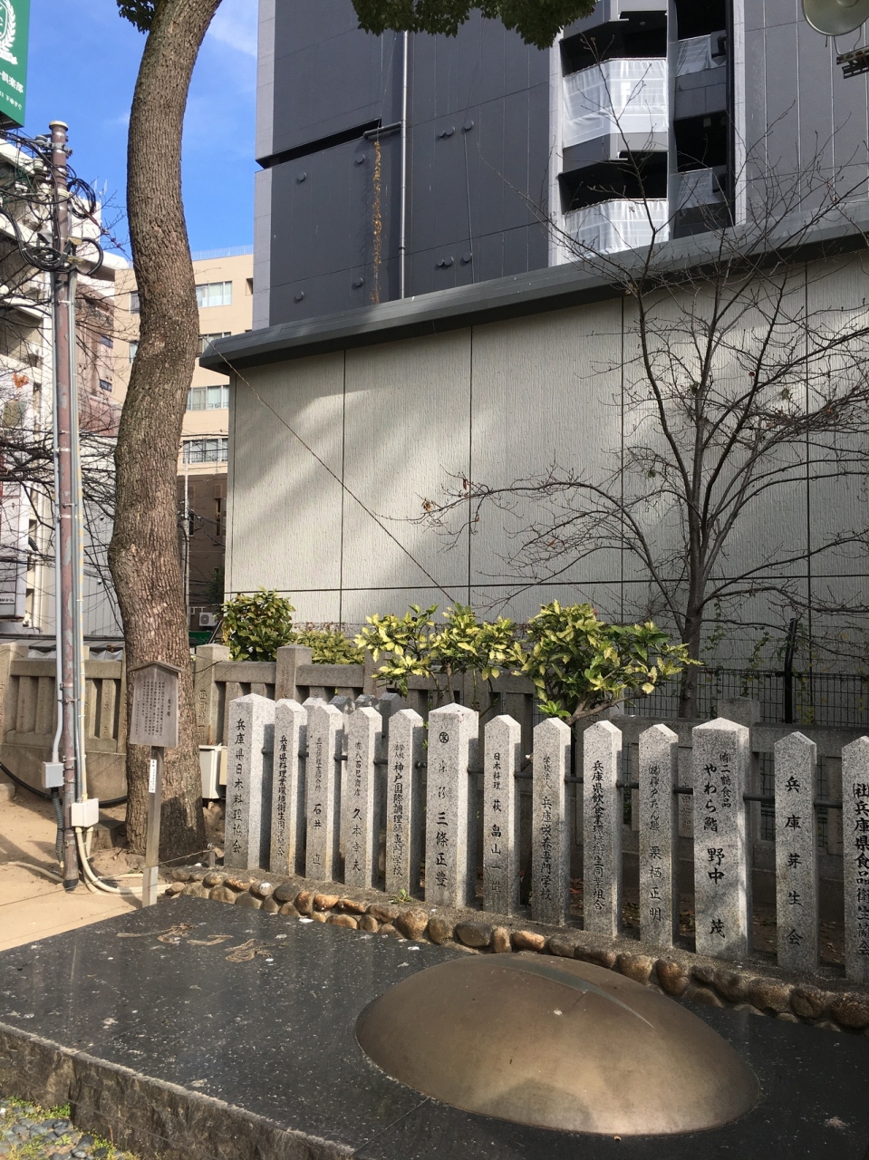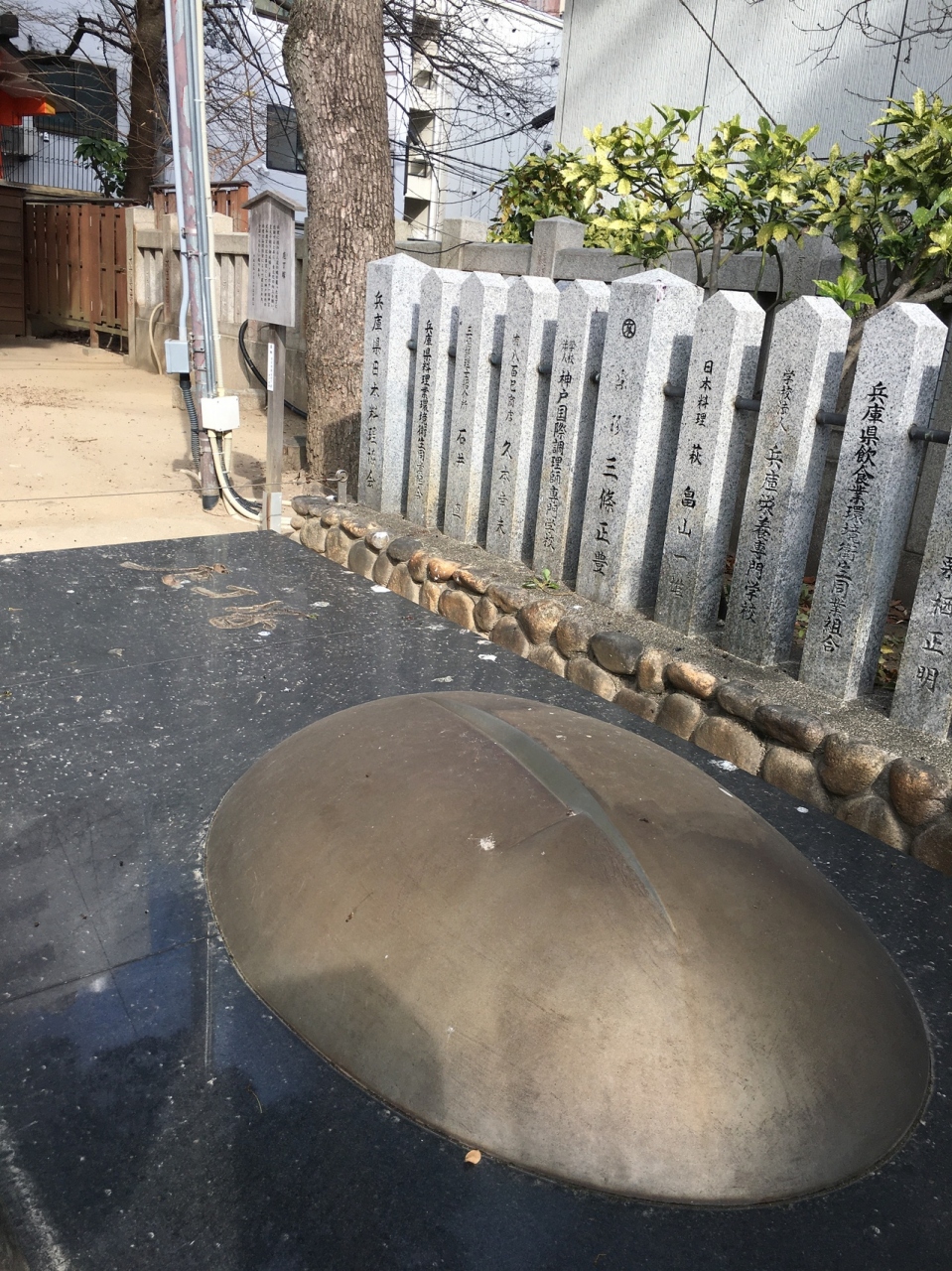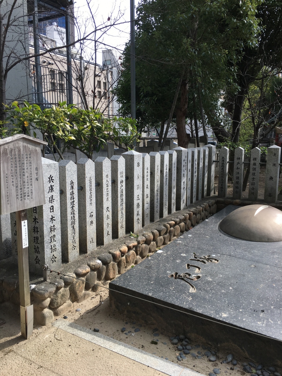 神戸市内の料理食品業者によって建立されたもので、包丁に感謝し、食文化の向上を祈願した塚です。長方形の地面にへばりついた感じで立派な石碑でした。丸まったものがあり、上の部分に包丁が刻まれていました。タイムカプセルにも見えた塚でした。