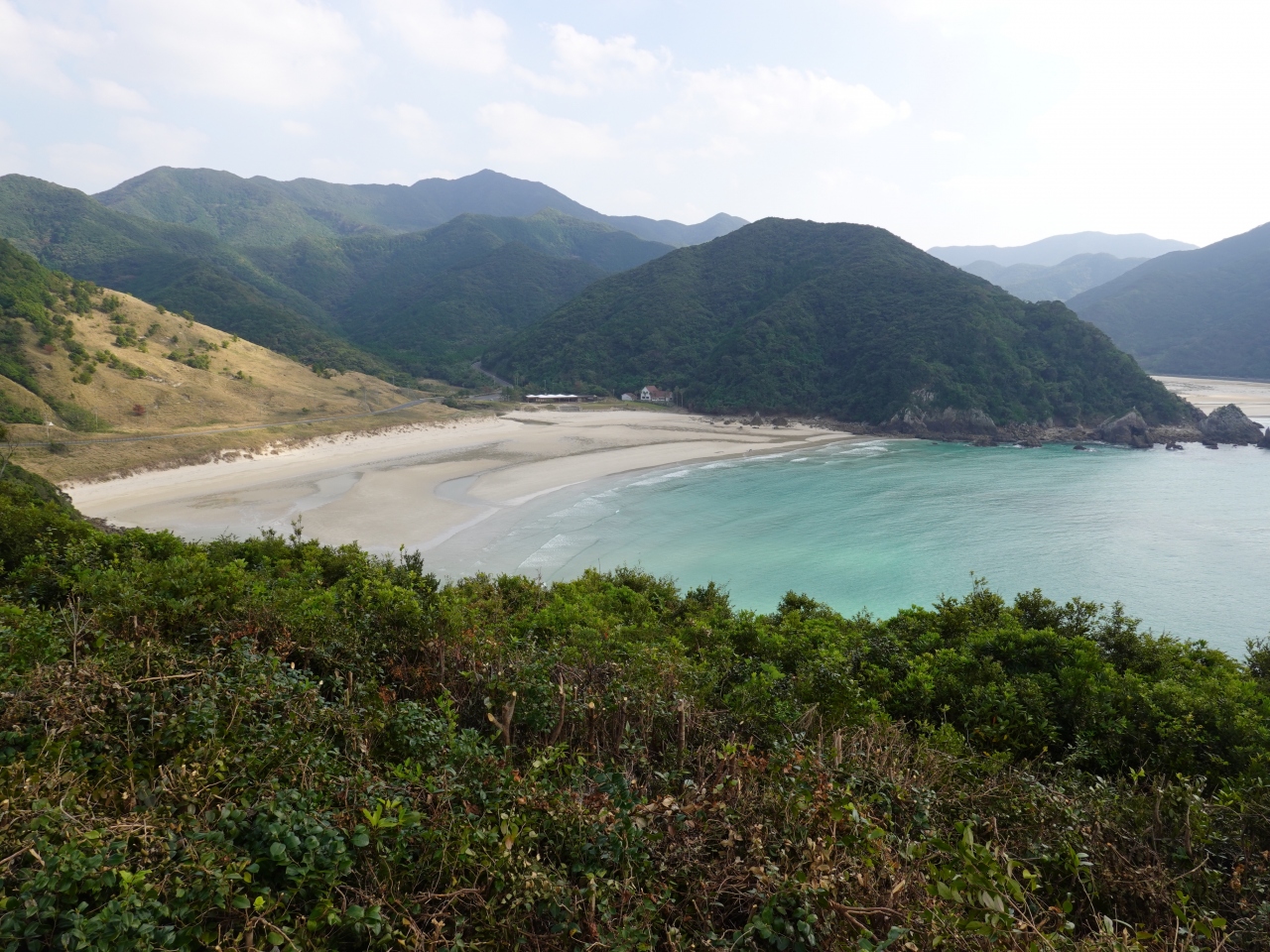 五島列島福江島西部の「高浜」は、山あいに位置するとても美しい浜です。車で1分ほどの魚藍観音展望所からはその全景を眼下に一望できます。10月末に訪れたところ周囲の山の濃い緑と、エメラルドグリーンの美しい海の対比が素晴らしかったです。
