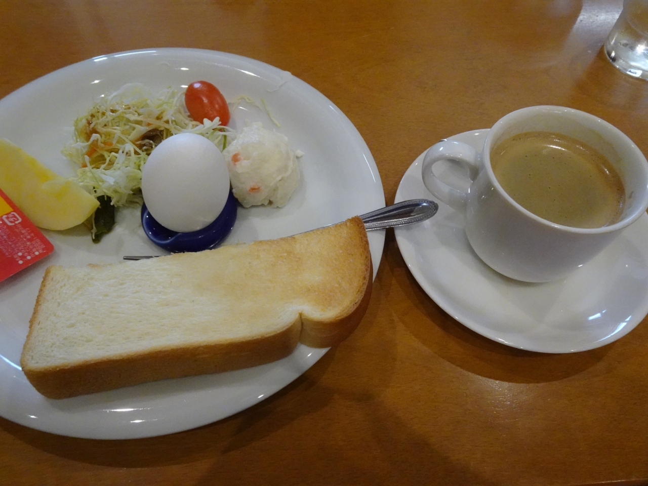 内容はドリンクに半切りのトースト、ゆで卵にサラダ、ちょっとした果物の組み合わせ。茶碗蒸しは付いていません。パンは2種類から選択できますが、クロワッサンは既に品切れでした。値段390円は良心的。当日は未明に朝食をとったので小腹を充たすには丁度よい量でした。
