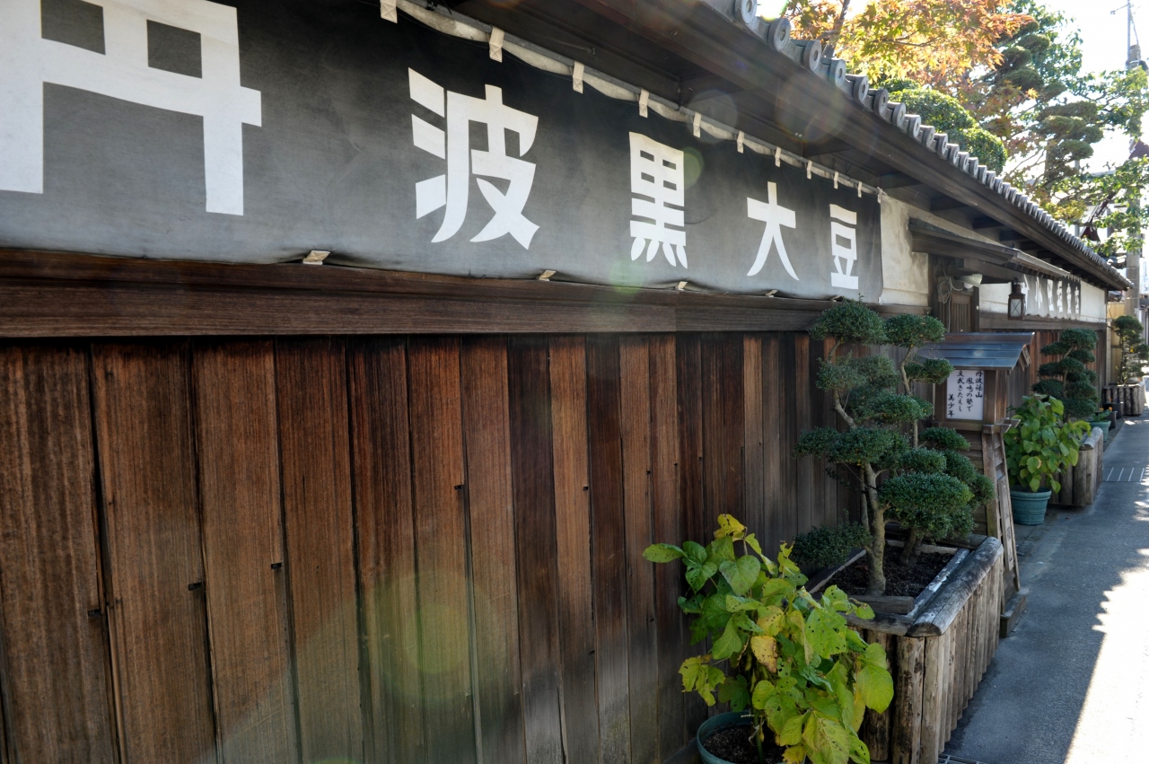 丹波篠山の城下町にある黒豆専門店だ。この地方で収穫される「丹波黒」という特産品を扱っている。店のたたずまいも魅力の一つだ。外観はすぐにそれとわかる蔵造り風で、のれんに「黒大豆」の文字。品ぞろえはさすがで、丹波黒を知らない人でも楽しめそうだ。この日は甘納豆風のしぼり豆を購入した。