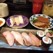 せっかく富山に来たのだから、おいしい魚が食べたーい。というわけでネットで見つけたこちらの店に…。ちょうどお昼時だったこともあり、店の前には10名ほどが待っていました。30分ほど待ちようやく入店。大手チェーン店とは違い店内は結構狭め。一応“レーン”は回っていましたが紙に注文を書くスタイル。おそらくコロナ対策かもしれません。ランチとしていくつかセットメニューがありましたがこの日は土曜日でサービスなし。ということでメニューにあった“本日の特ねた”「寒鰤づくし(1460円)」と「あおりいか3種(390円)」をオーダー。