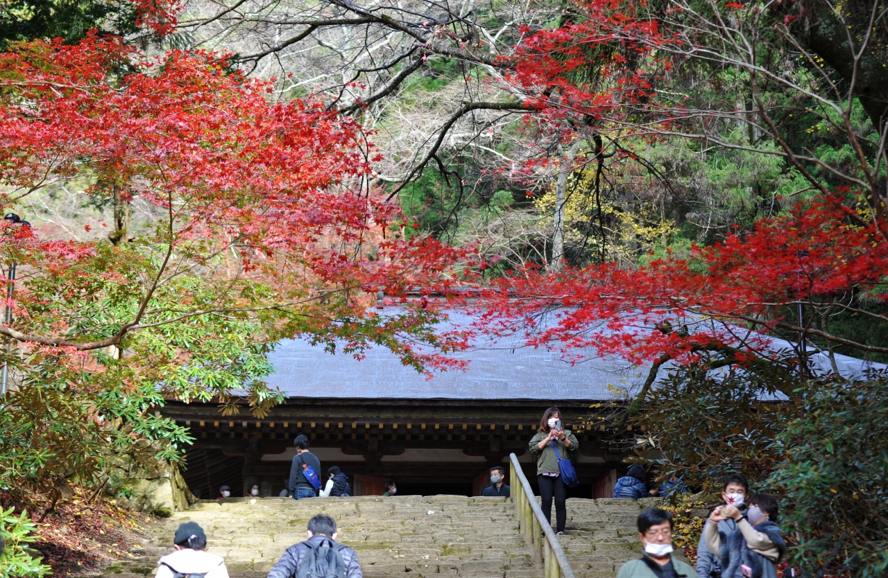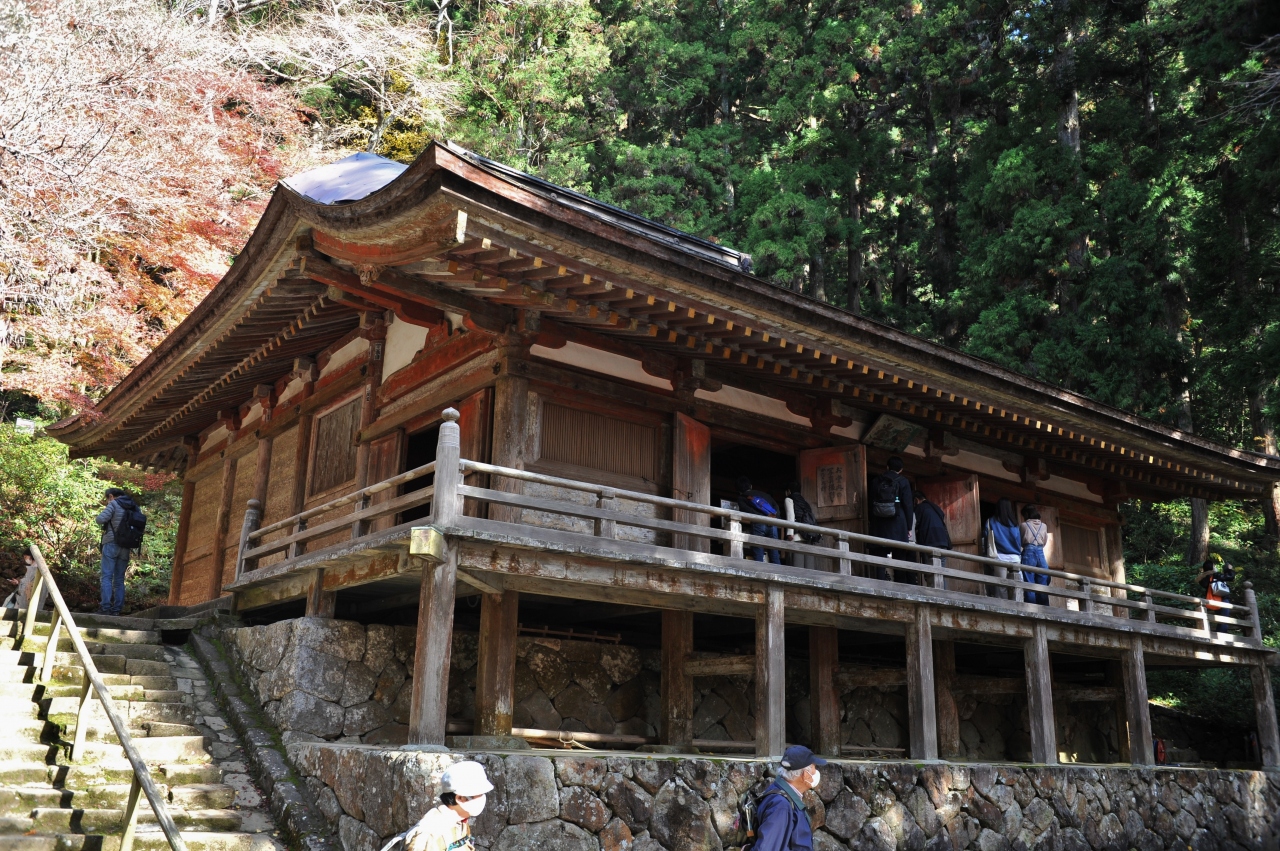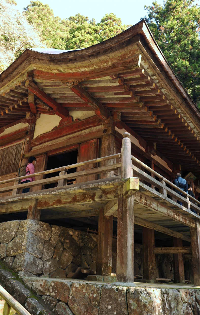 鎧坂の石段とセットになった風景が楽しめるお堂だ。そう大きくはないが、国宝建築物。こけら葺き寄棟造りのお寺の格にしては小ぶりな建築物だが、見事なエイジングの外観が目を引く。この地にたたずんできた年月が感じられるような雰囲気だ。前面は少し高く造った懸け造りで、少し変わったデザインだ。