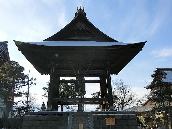 登録有形文化財となっている善光寺の鐘楼は、本堂の南東側にあります。江戸後期に造られた入母屋造で檜皮葺となっています。柱が4本ではなく、6本あり変わっているなと思いました。これは「南無阿弥陀仏」6字にちなんだものだそうです。