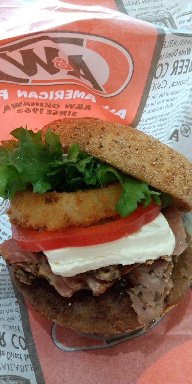 アメリカンな店内は、明るい雰囲気。サーティーワンも同じ店内にありました。初めてなので、私はThe A&Wバーガー約700円を購入。とてもボリューム満点で美味しかったです。また、カーリーフライとオレンジジュースもとても美味しくて、満足しました。ちなみに火曜日に、お得なキャンペーンを実施しているそうです。