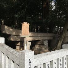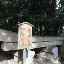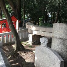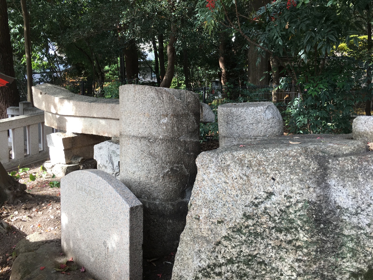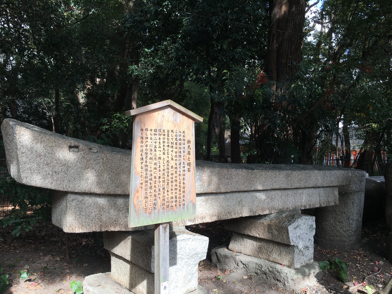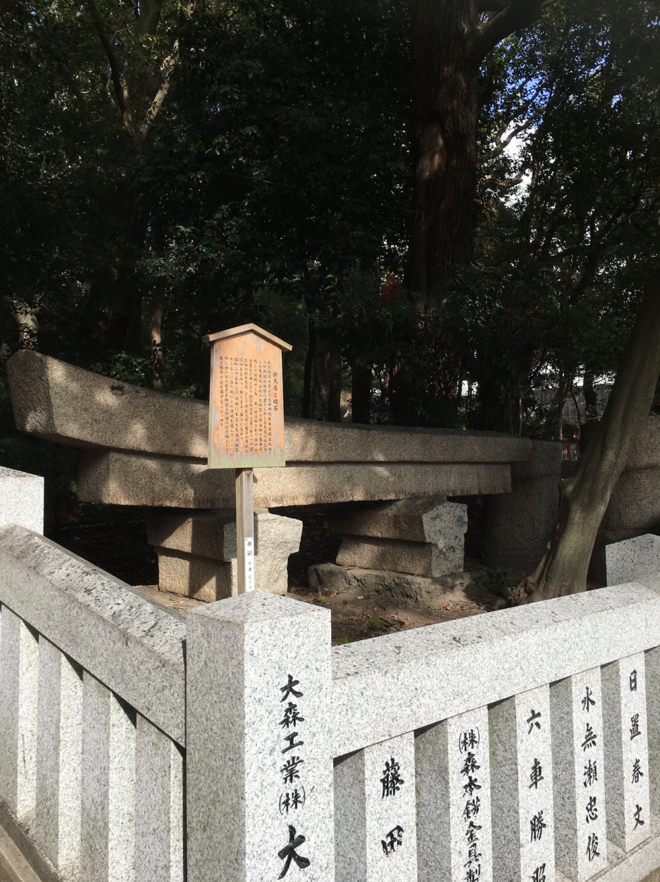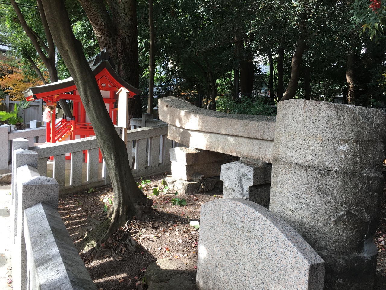 生田の守に隣接していて、境内の遊歩道沿いにありました。鳥居の上部だけが石の台座にのり、下は埋まっているように見えましたが安政の大地震の時に両サイドを支えているものは倒壊したとのことでした。少し奇妙な感じでした。