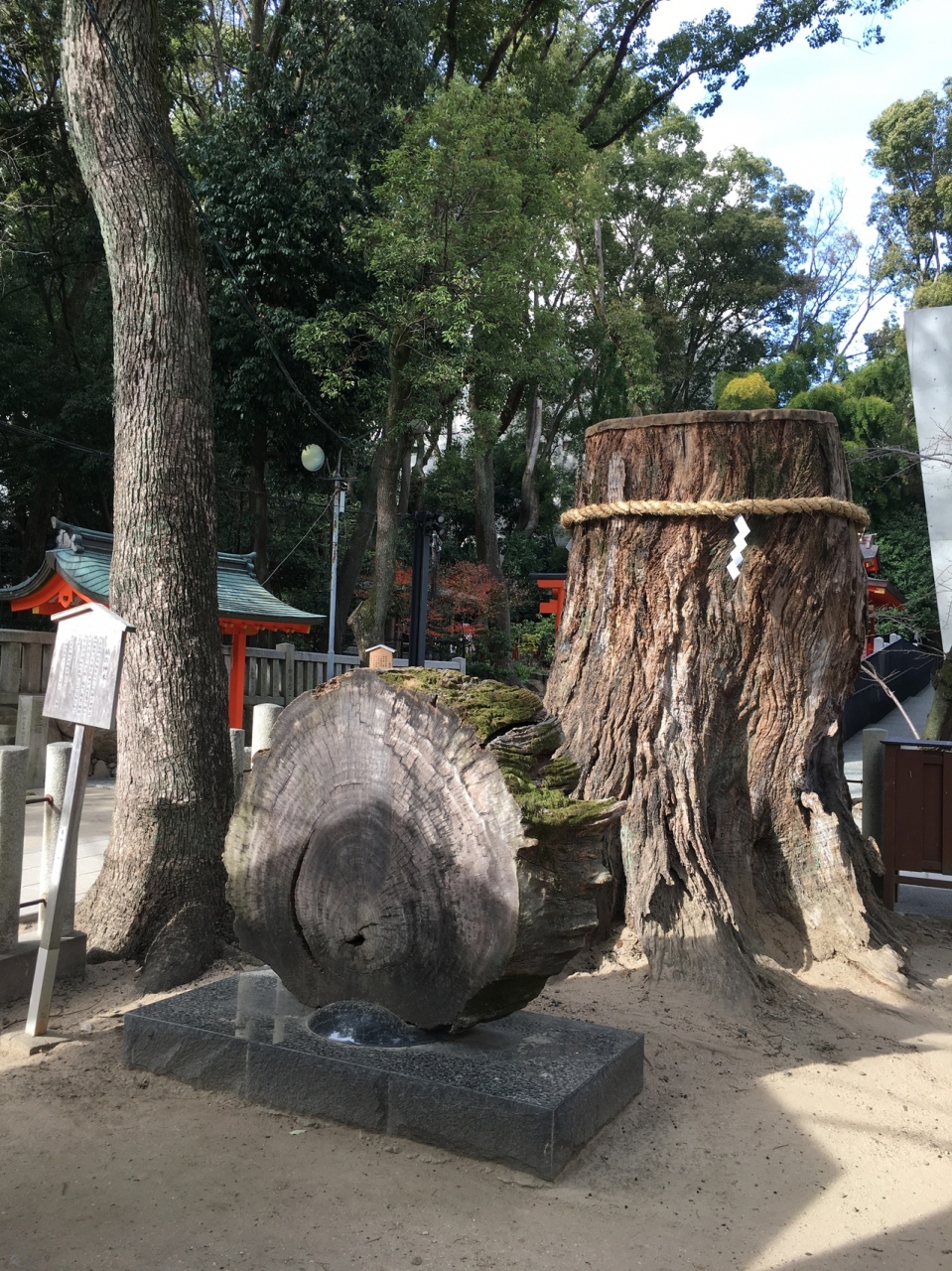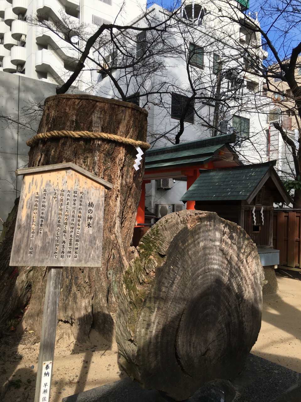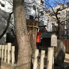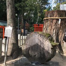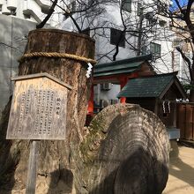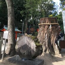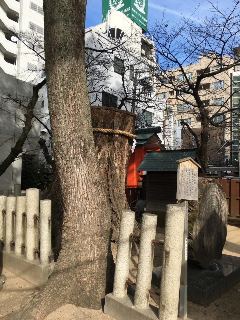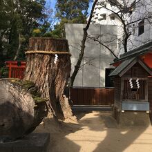 東門の出入口付近にありました。細長い木の横に立っていて太い木ですが高さは2メートルぐらいで昭和の大空襲で焼けましたが再生して、復活した木です。注連縄で巻き、横には大きな切り取った切り株があり年輪が歴史を物語っていました。