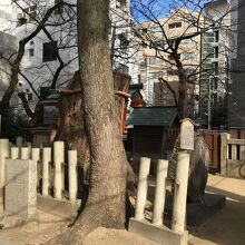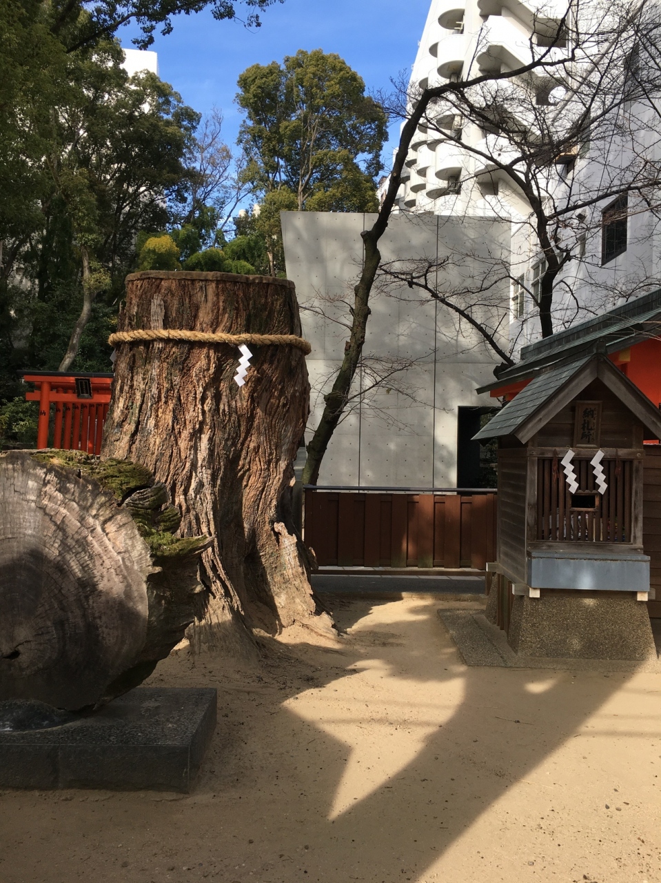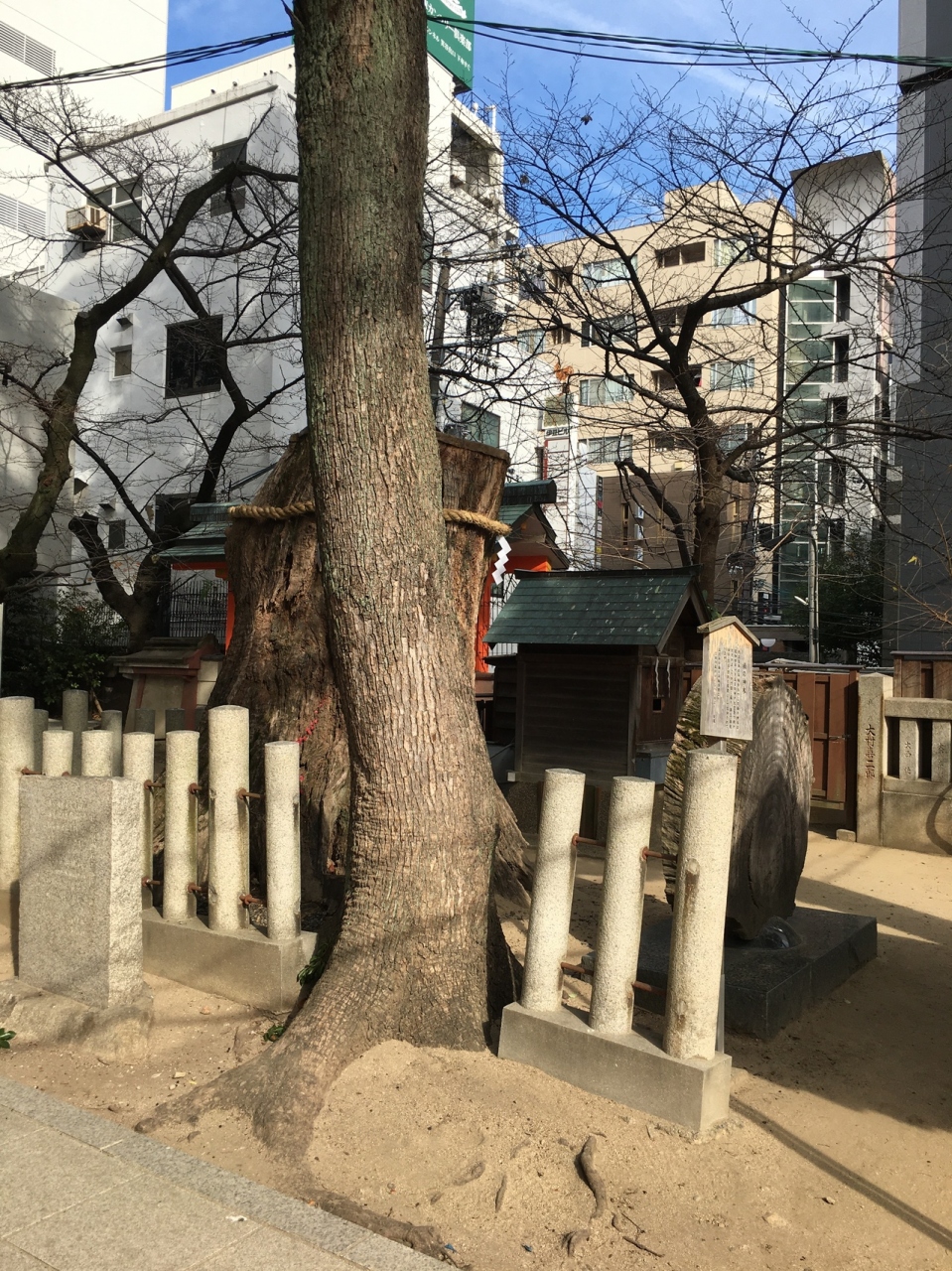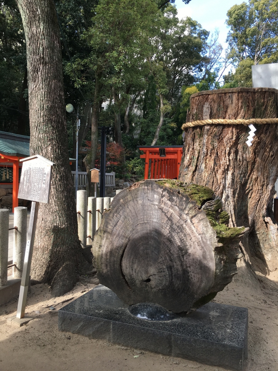 東門の出入口付近にありました。細長い木の横に立っていて太い木ですが高さは2メートルぐらいで昭和の大空襲で焼けましたが再生して、復活した木です。注連縄で巻き、横には大きな切り取った切り株があり年輪が歴史を物語っていました。