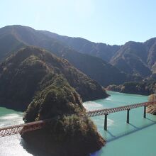 奥大井湖上駅のある湖で、訪問時、湖面がエメラルドグリーンでした。