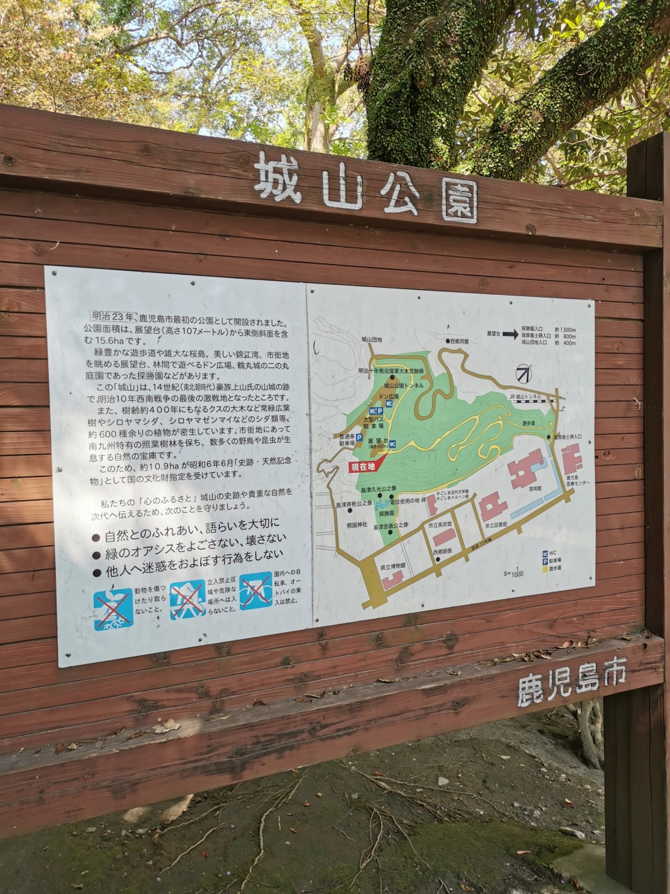 鹿児島・宮崎・熊本の南九州ドライブ旅行。鹿児島市内の観光で城山公園へ。裏手から自動詞やで回れます。無料の駐車場があります。車を停めて展望台へ歩いて5分ほどで展望台です。目の前に桜島と鹿児島市内が一望です。素晴らしい景色でした。