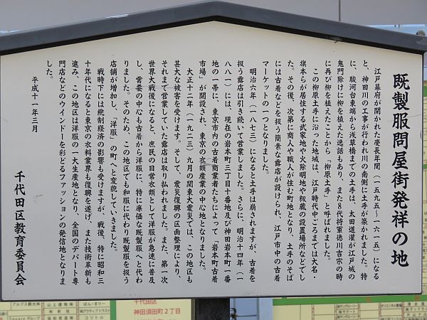 既製服問屋街発祥の地は、神田川に架かる和泉橋の南詰にあります。発祥の地といっても、石碑があるわけでもなく、高札を模した説明板があるだけでした。そのため、自分以外゛に足を止める人はいませんでした。隣には、千代田区が設置した町名由来板もありました。
