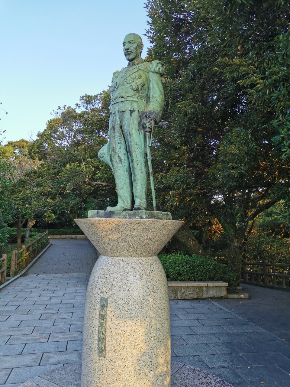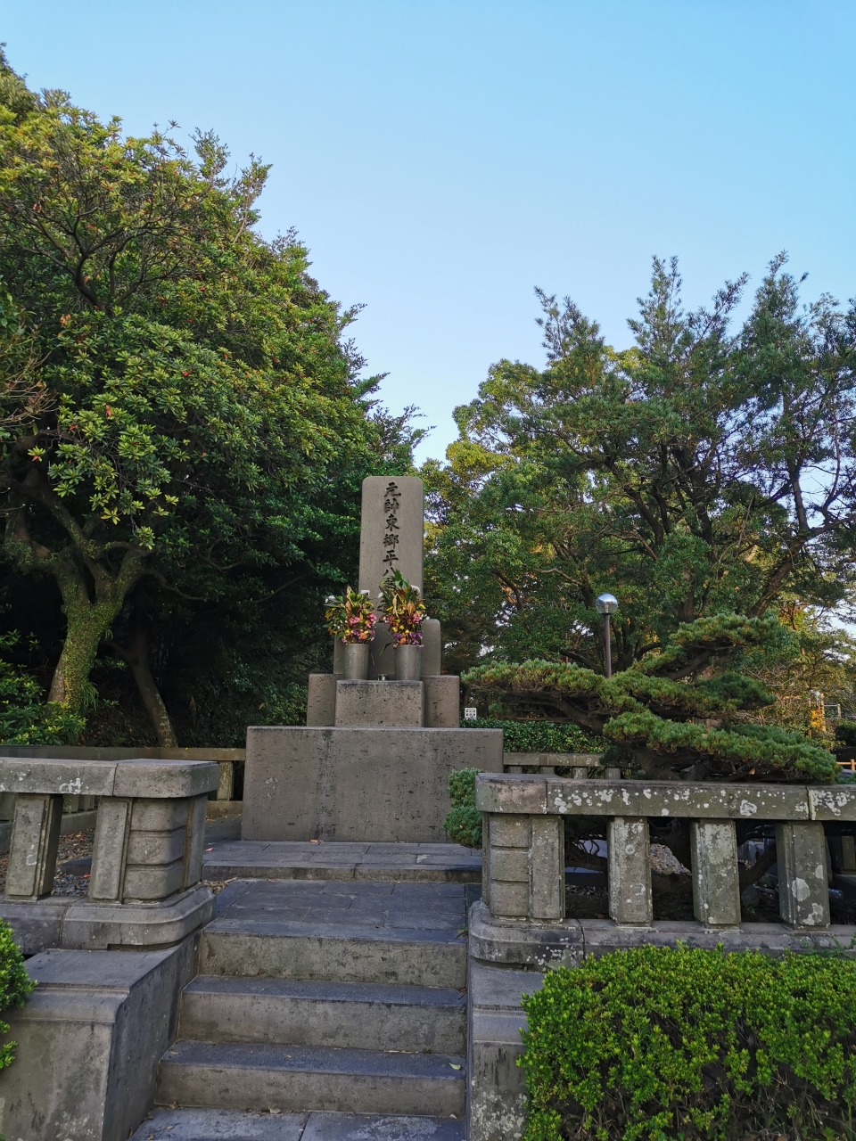 鹿児島・宮崎・熊本の南九州ドライブ旅行。最終日に鹿児島空港に戻る道中に立ち寄り。東郷平八郎の墓地と銅像がある多賀山公園に立ち寄りました。無料の駐車場があります。小高い丘になっていて目の前に桜島と錦江湾が一望できる場所に東郷平八郎銅像があります。素晴らしい景色の公園でした。