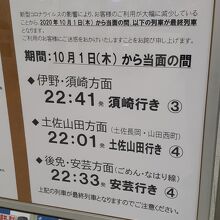 2020年12月29日現在、高知駅から各方面への最終列車が所定より早くなっているそうで、駅の掲示によると土佐山田方面は22時01分発土佐山田行き(23時10分発土佐山田行きは運休)、伊野・須崎方面は22時41分発須崎行き(23時10分発伊野行きは運休)になるとのことでした。